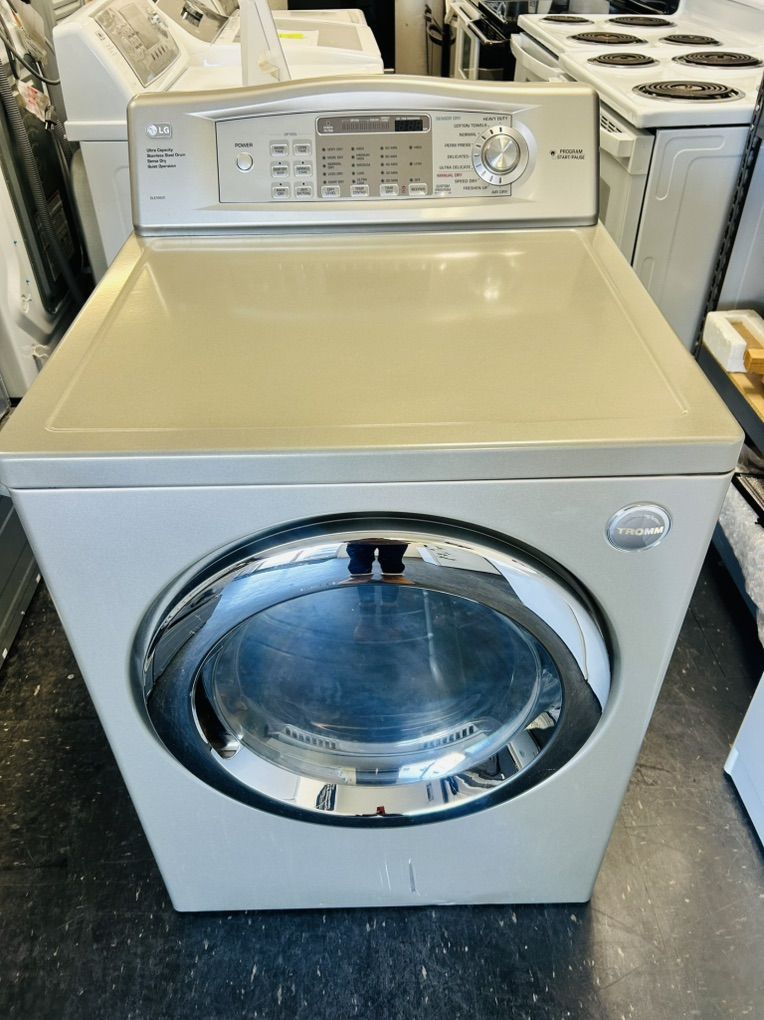 Lg Tromm dryer electric ultra capacity sense dry quiet operation stainless steel drum heavy duty cotton normal delicate speed dry freshen up air dry damp dry wrinkle care anti bacterial etc..They work great, clean, 45 day warranty, delivery/install available.