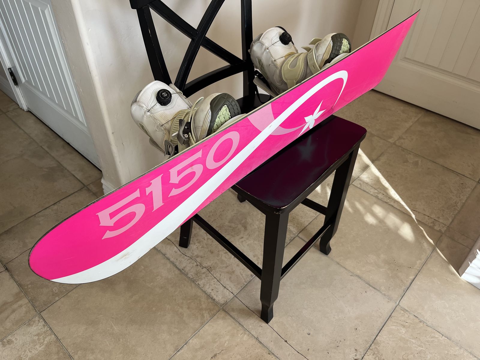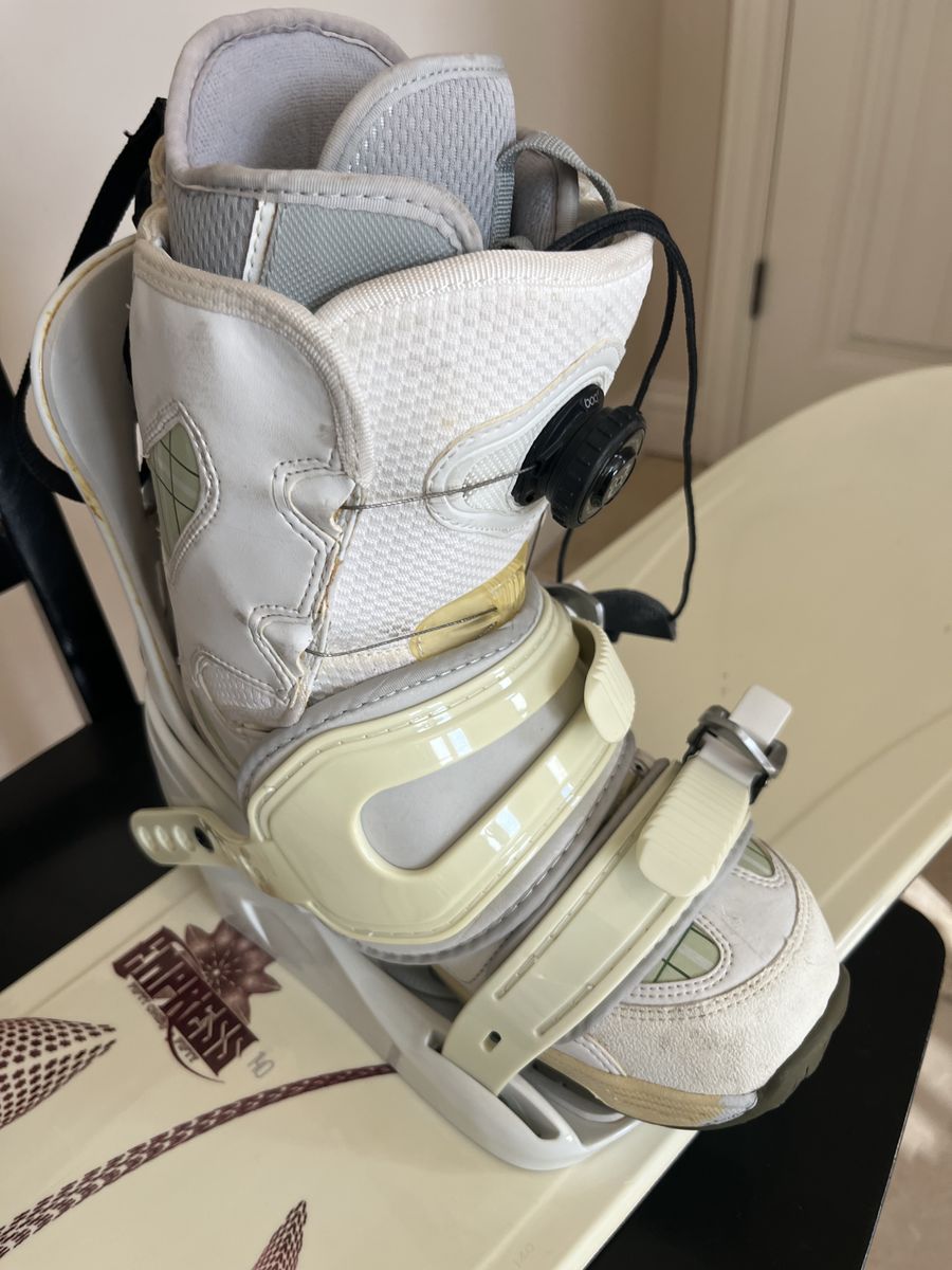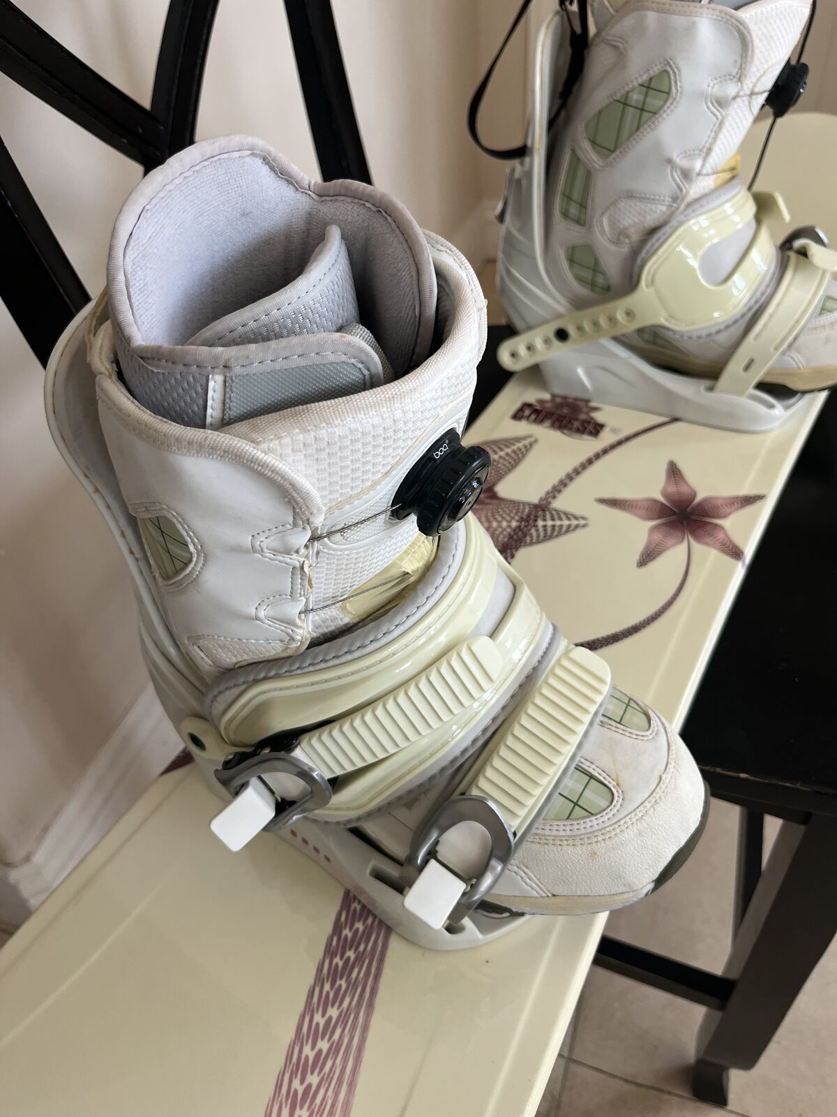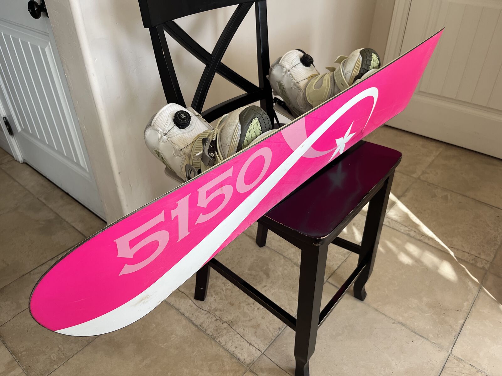 Little Use 140 CM snowboard with medium 5150 bindings on a Impress 5150 white snowboard with pink underside, check pictures for more details.DC BOA size 8.5 L snowboard boots, little use as well. Located in Saratoga Spgs I do have other snowboards and boots available, helmets, goggles, and gloves.