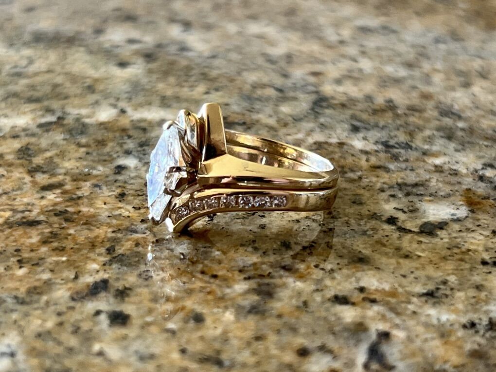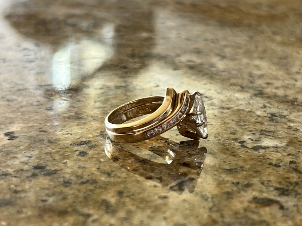 Stunning designer Israeli Leviev 14K yellow gold wedding set featuring a 1.10 carat marquise-cut natural diamond graded G color, SI2 clarity.