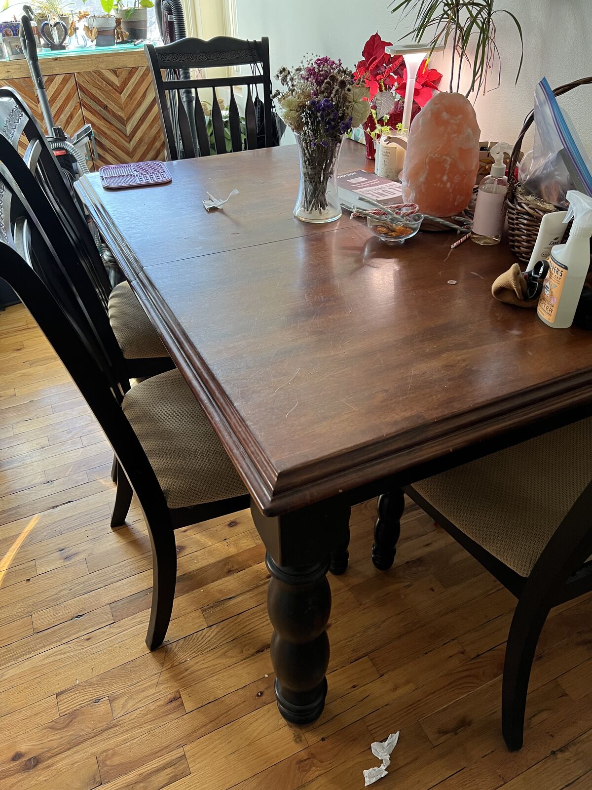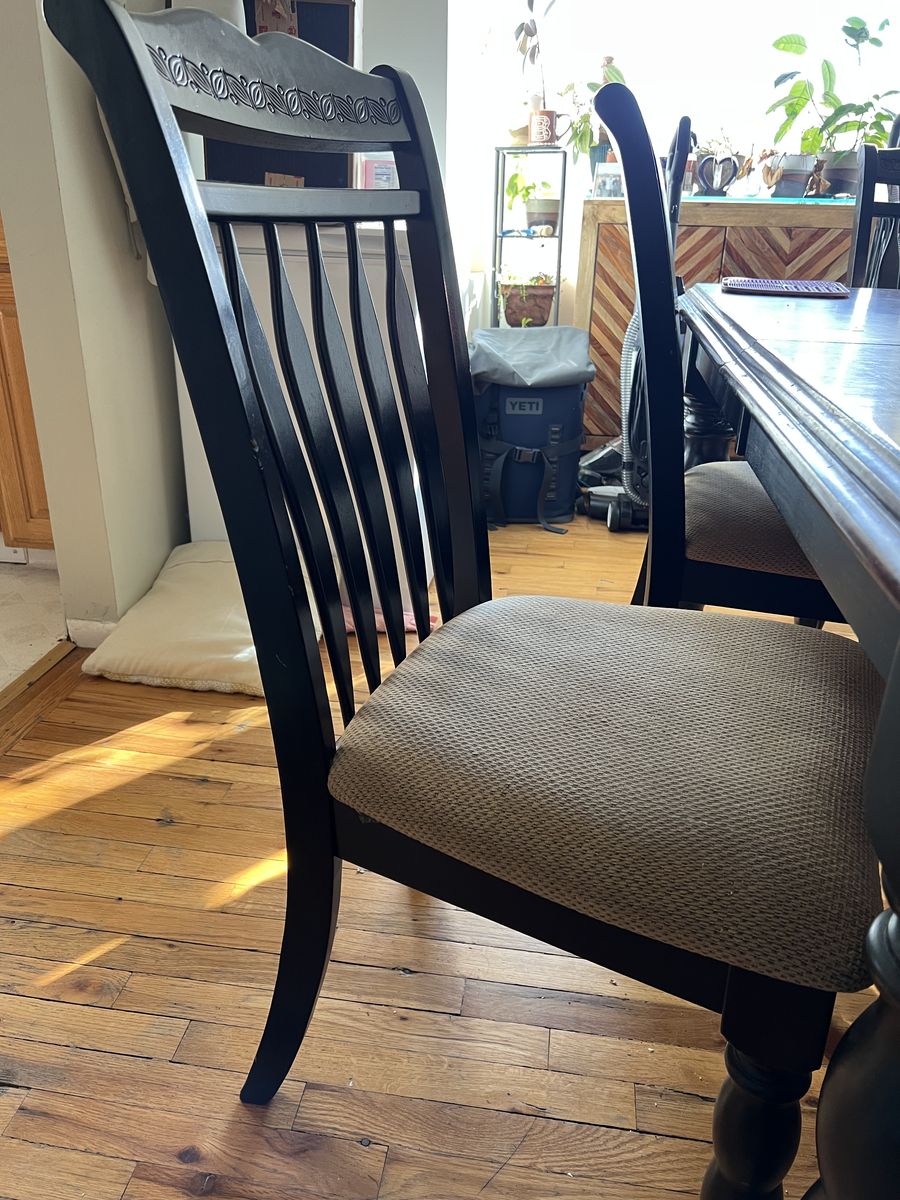 VenmoHeavy, solid cherry wood dining table. In great shape! Comes with leaf and four chairs. Able to accommodate 4-6 comfortably without the leaf. Chairs and table could be sold separately. Pickup preferred, but could possibly deliver in the greater Ogden area for a small gas and time fee. Will not deliver chairs and table separately, you would have to buy them both. The table will come disassembled but is easy to reassemble. It’s moved many times, we just won’t have room for it soon. Dimensions below, make an offer. Thanks!