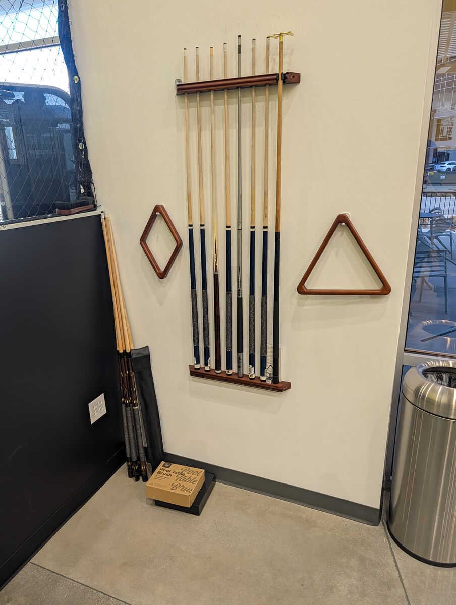 Accessories shown in photos wall-mounted cue rack, multiple cues, triangle racks, brush, balls etc. included