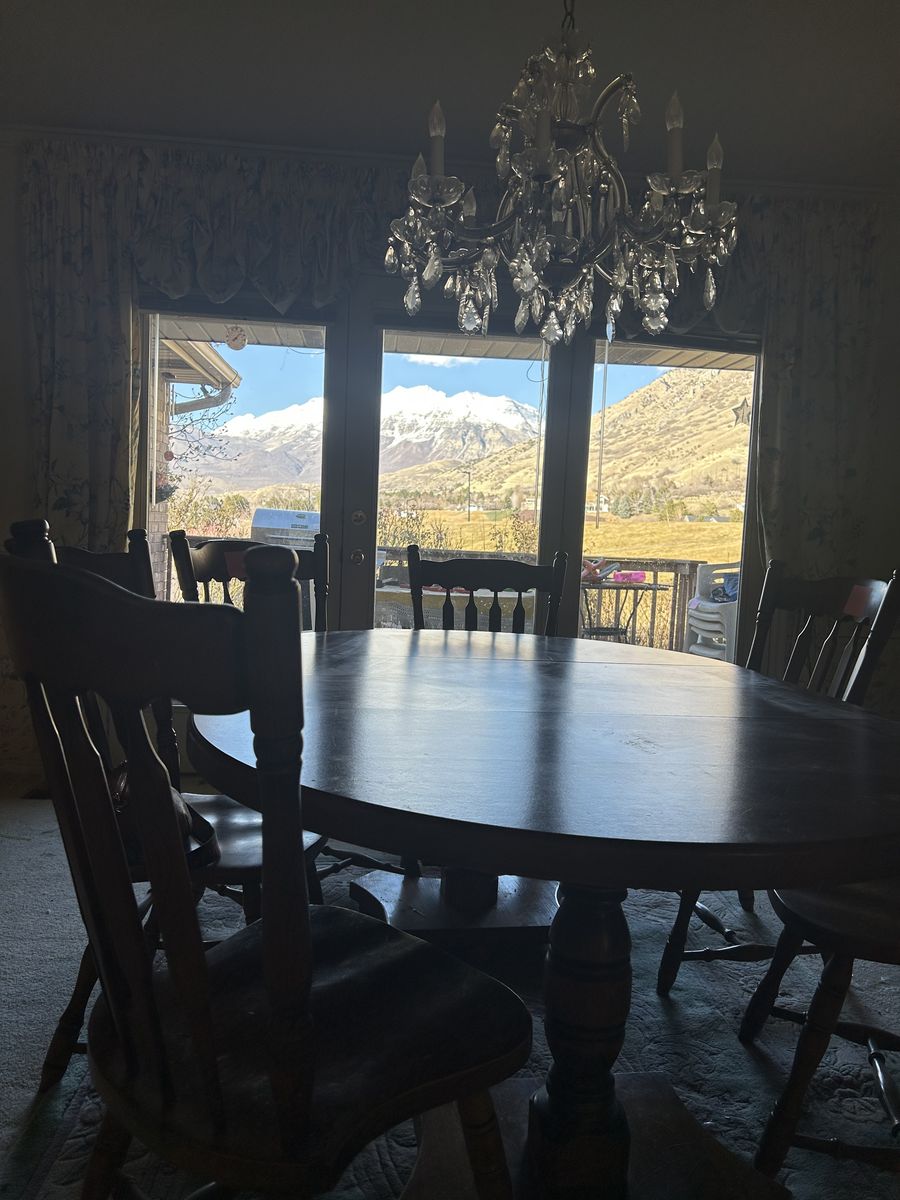 ApplePaySolid wood, vintage dining table and 8 chairs, sturdy and in great shape. 2 captain chairs and 6 regular chairs, extendable with 2 leaves. $100 or best offer just needs to be picked up asap
