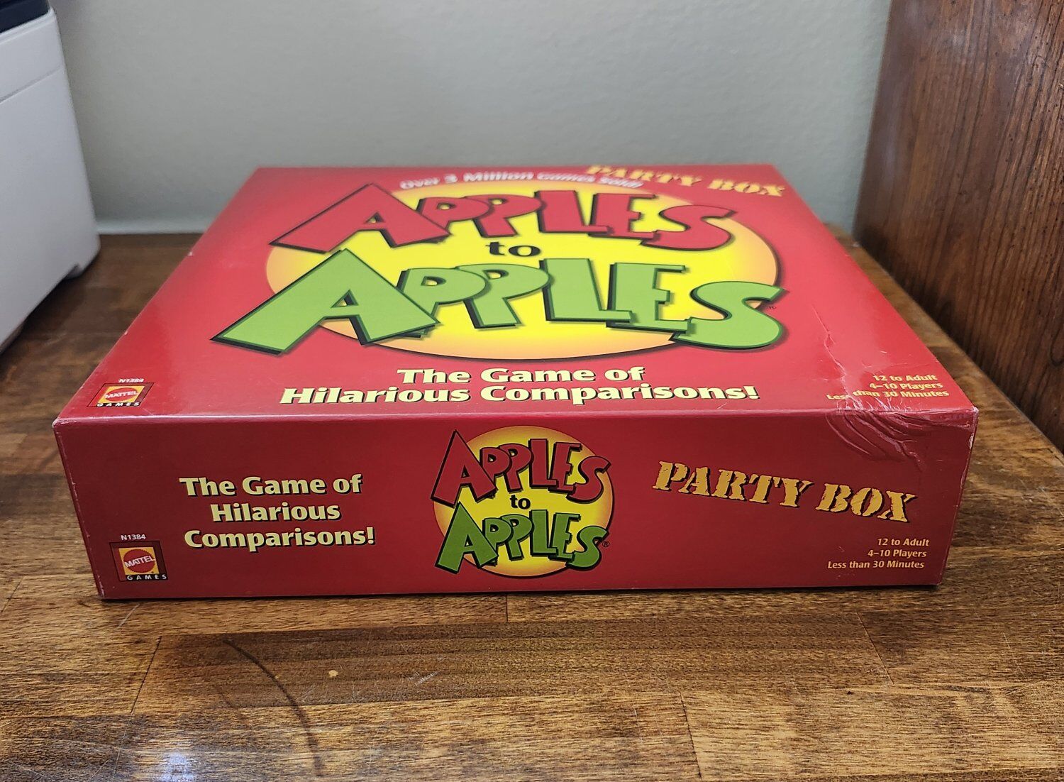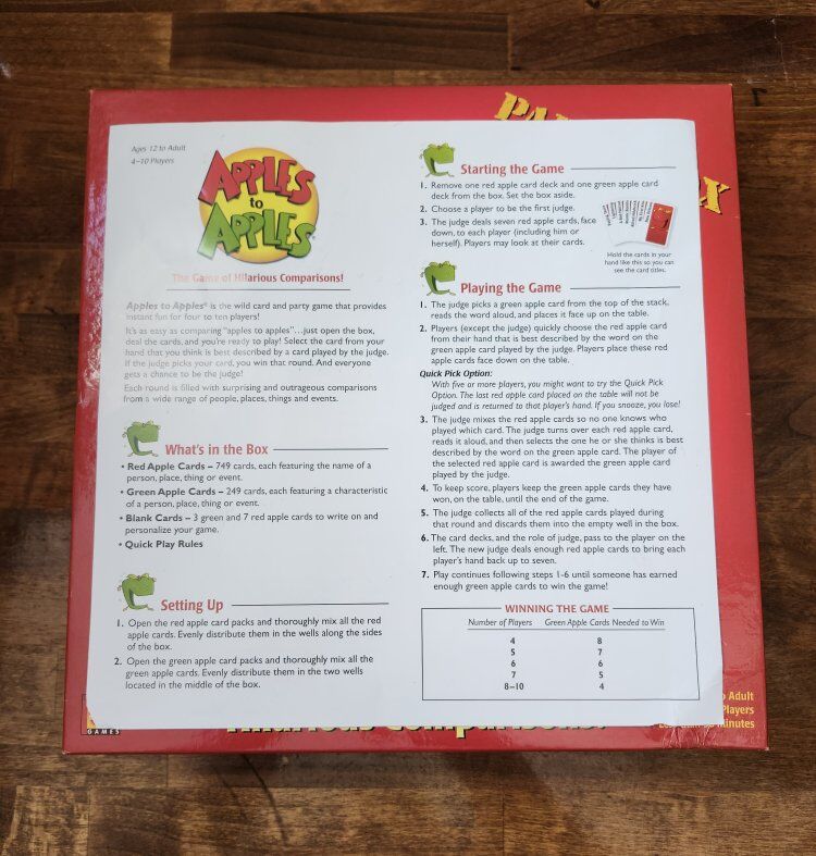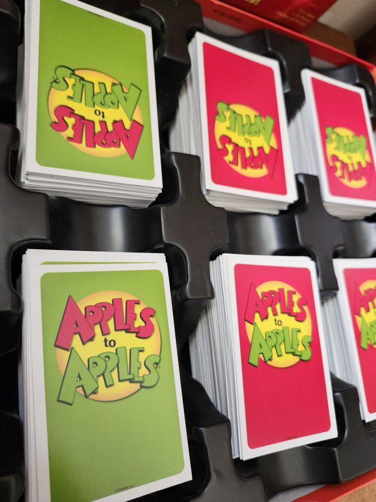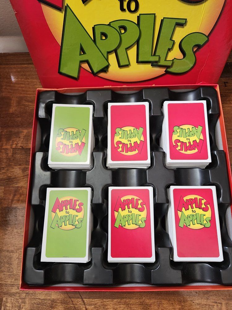 VenmoApples to Apples party box, complete and ready to play. All the cards are organized. There are 4 stacks of red cards, 2 stacks of green cards and instructions included. Game is in good shape and everything’s clean. Nothing missing. Small dent on corner or box (shown in picture). Great for family game nights or small groups.