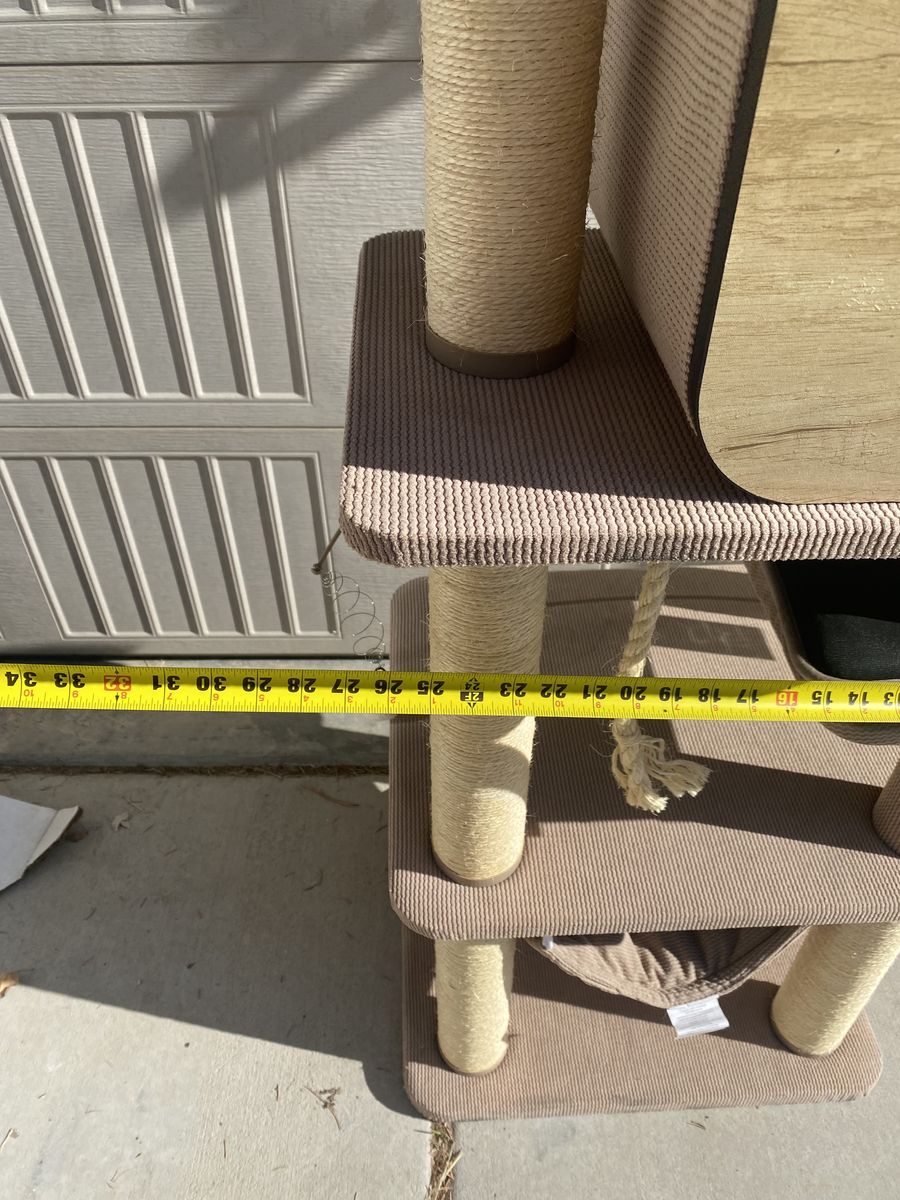 Features: • Enclosed cat condo hideaway • Multiple platforms • Large top perch with cushion • Hanging hammock • Sisal scratching posts • Built-in toy attachments • Approx. 60 inches tall