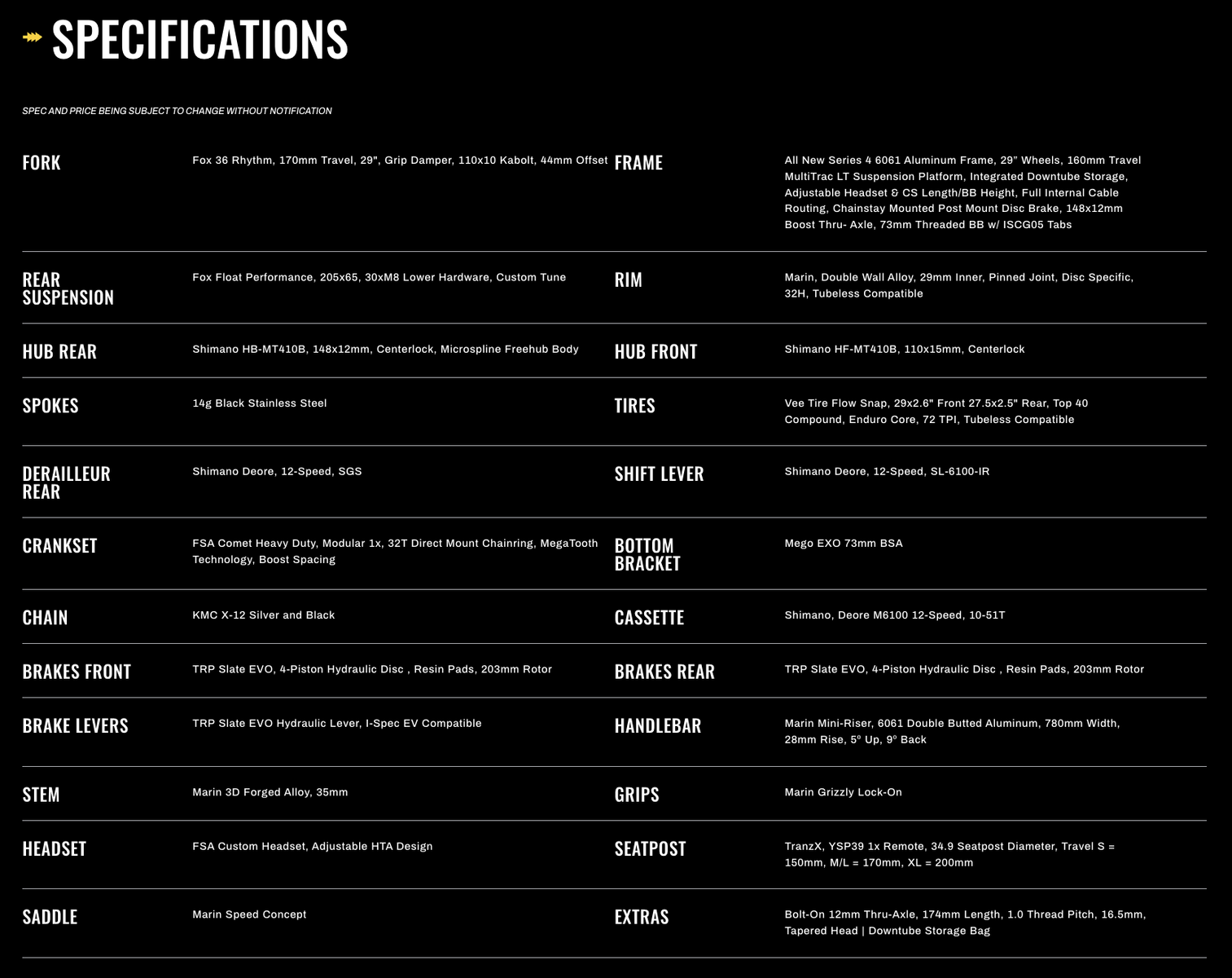 "The new Marin Alpine Trail Series 4 aluminum MultiTrac 2 LT frames feature mixed 29”/27.5” wheels, 170mm front and 160mm rear travel, and the utmost in adjustability. Riders can alter the head tube angle and bottom bracket/chain stay length, as well as run 29” rear wheels if desired. “Bear Box” downtube storage includes a zippered nylon bag to house trail essentials, and a 34.9mm seatpost increases strength and is compatible with the latest dropper posts."