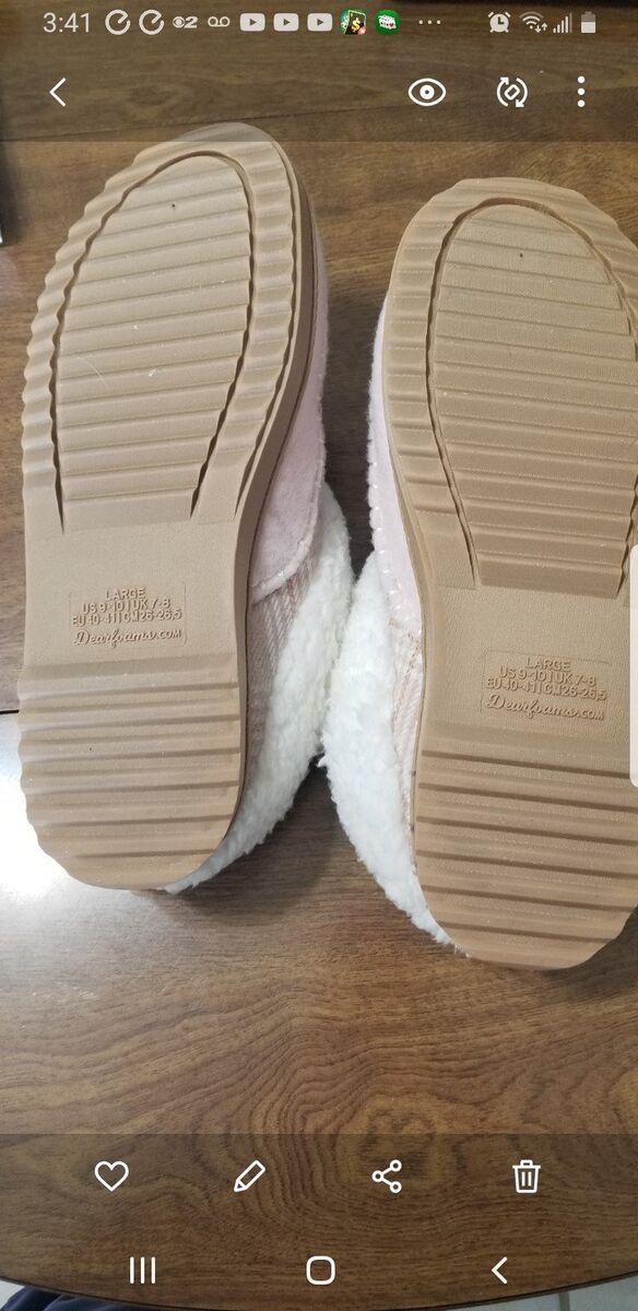 Dearfoam Nyla Felted Clog Slippers. True in size- women's 9-10. Color pale mauve. New, never have been worn. Purchased to replace a worn out pair. Waited to long to return. This style is so comfortable and supportive without being too hot. Easy on /off. Has temperature regulating super soft flannel/fleece inside. Indoor/Outdoor soles. Memory foam fleece insoles. Well made, last a long time. Easy to keep clean, machine washable. Treat yourself to a great slipper.
