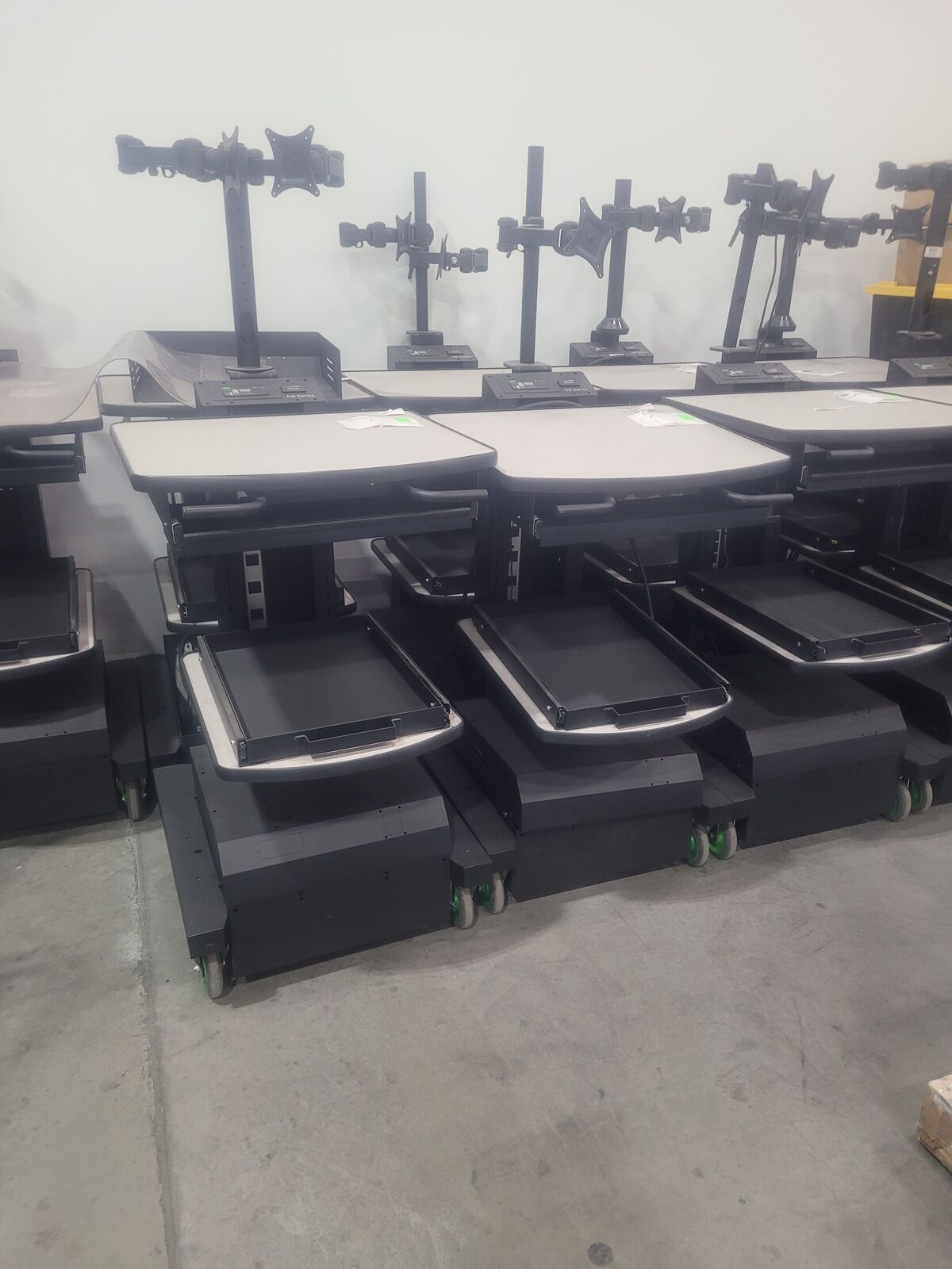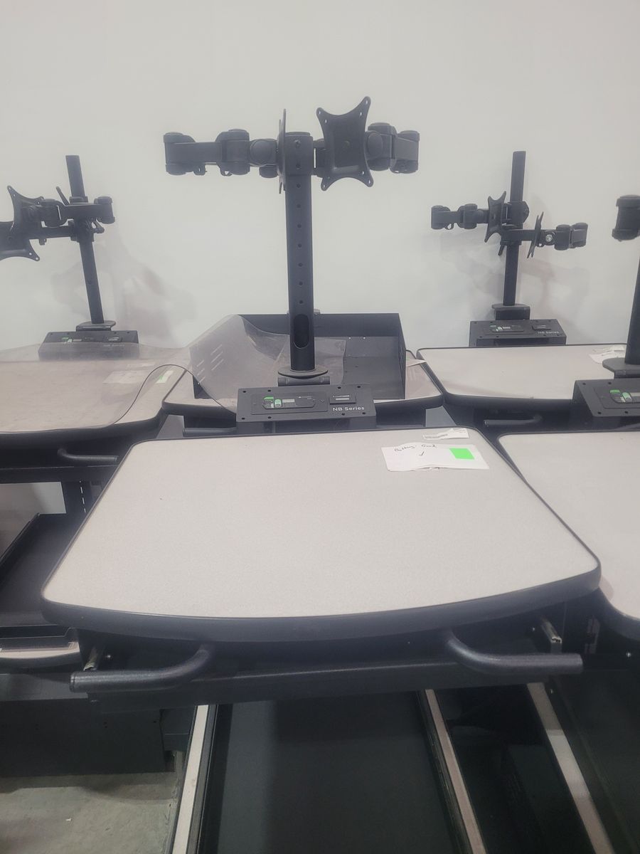 LOCAL ONLY, CASH ONLY. 8 Mobile computer carts! They have backup batteries to keep from shutting down while on the move. They come with dual monitor stands, but no monitors or peripherals. They are used, so may have scratches, light dents and may be missing the scanner plates. Please message with any questions!