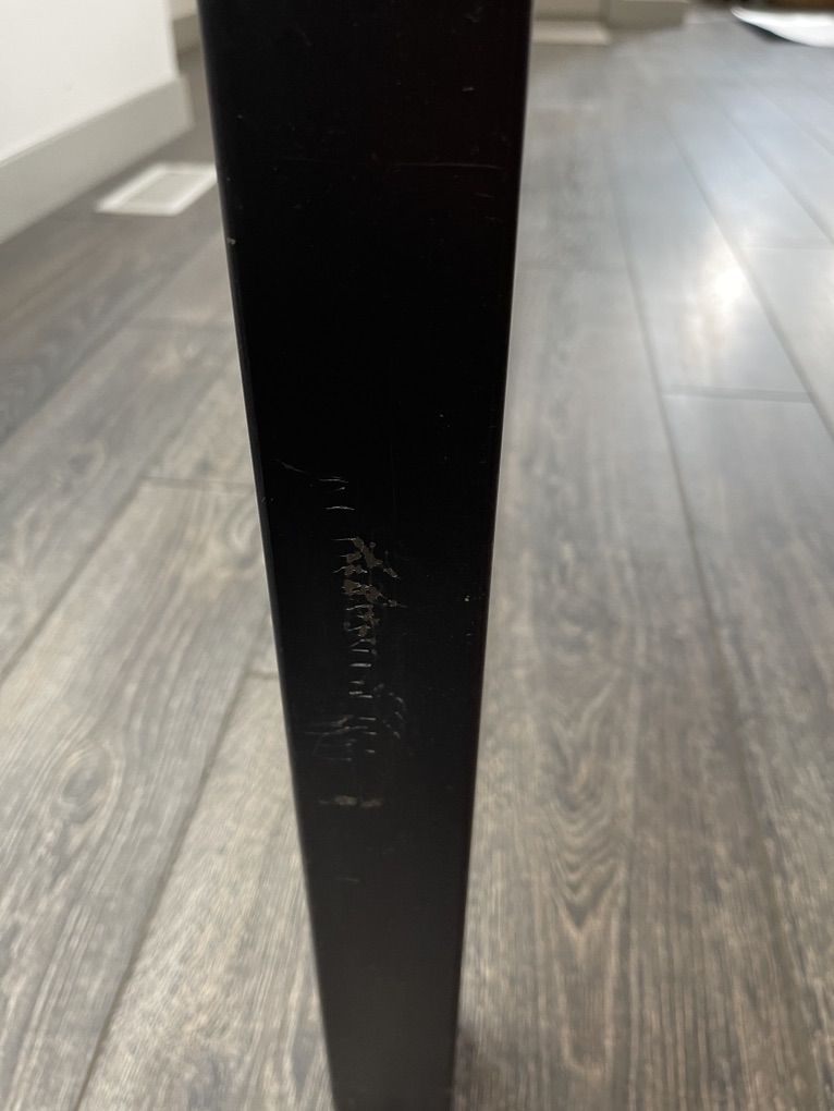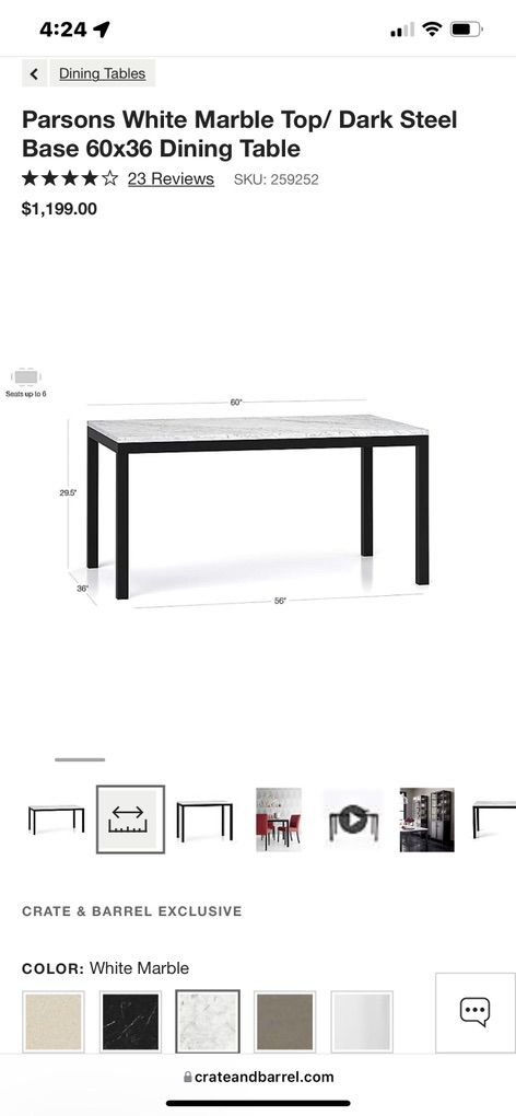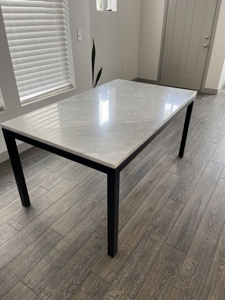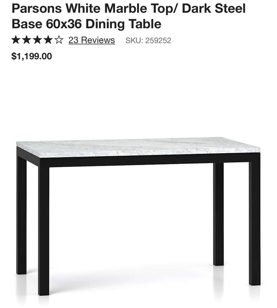 ApplePayCondition: Used - Good, minimal wear Crate & Barrel Parsons White Marble Top/ Dark Steel Base 60x36 Dining Table: I bought this dining table from Crate & Barrel for $1200. It is in incredible condition. I’m asking to sell it for $800 because it has some small scratches on one of the legs (included in pictures).