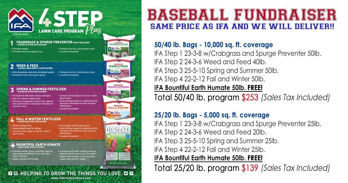 VenmoIFA Fertilizer Baseball Fundraiser! GET IT FOR THE SAME PRICE AS THE STORE AND WE WILL DELIVER!!! My sons and their baseball teams are selling IFA fertilizer to pay for tournaments and uniforms. We will pick up from IFA and deliver to you! We're selling the 4-step program for the same price you can get it at IFA which includes a free bag of Humate and we will deliver it to your house. Large bags (10,000 ft²): $253 or Small bags (5,000 ft²): $139. If you are interested, send me a text with your name and delivery address to 801-613-7109 and we will deliver it to your home. Also, please share this with any of your friends and family you think would be interested!