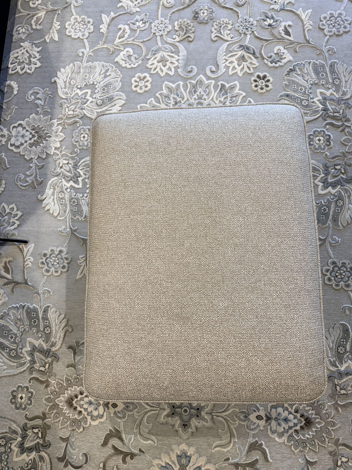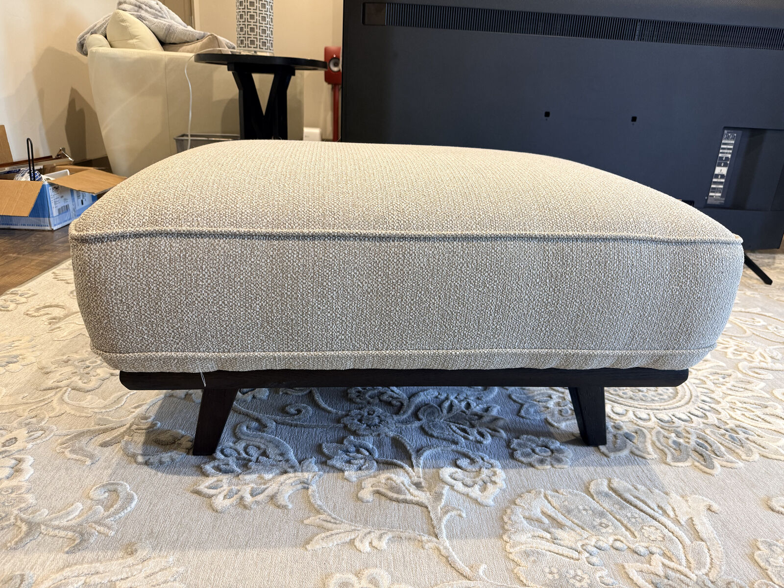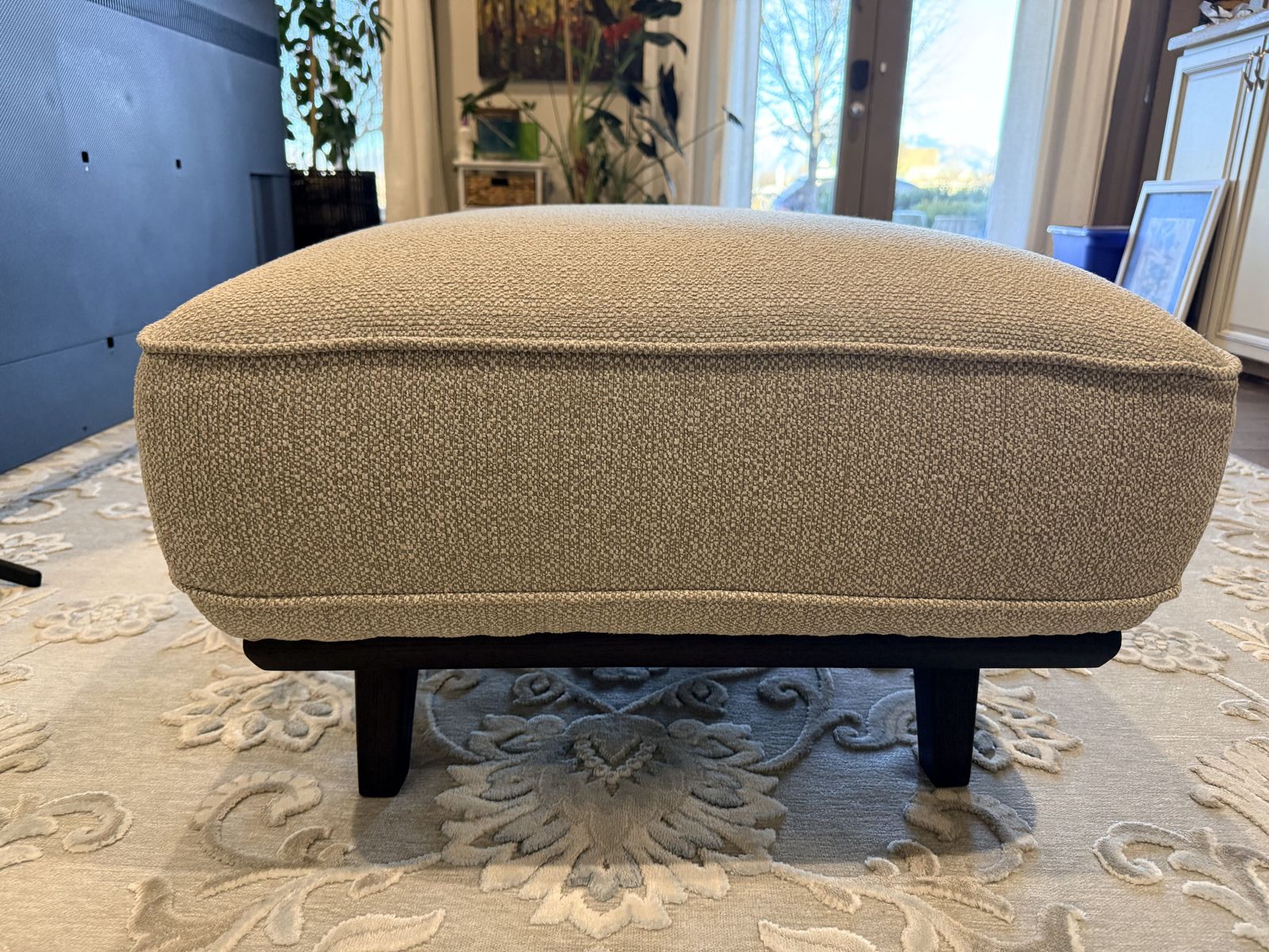 ApplePayNew! No stains or tears. Super clean. Aubrie Gray Ottoman from RC Willey Color: Miami Cobblestone Gray with Dark Oak legs I purchased this ottoman along with the matching chair on clearance and had it delivered, but when realized I didn't have space for the ottoman. Dimensions: 36W x 28D x 18H.