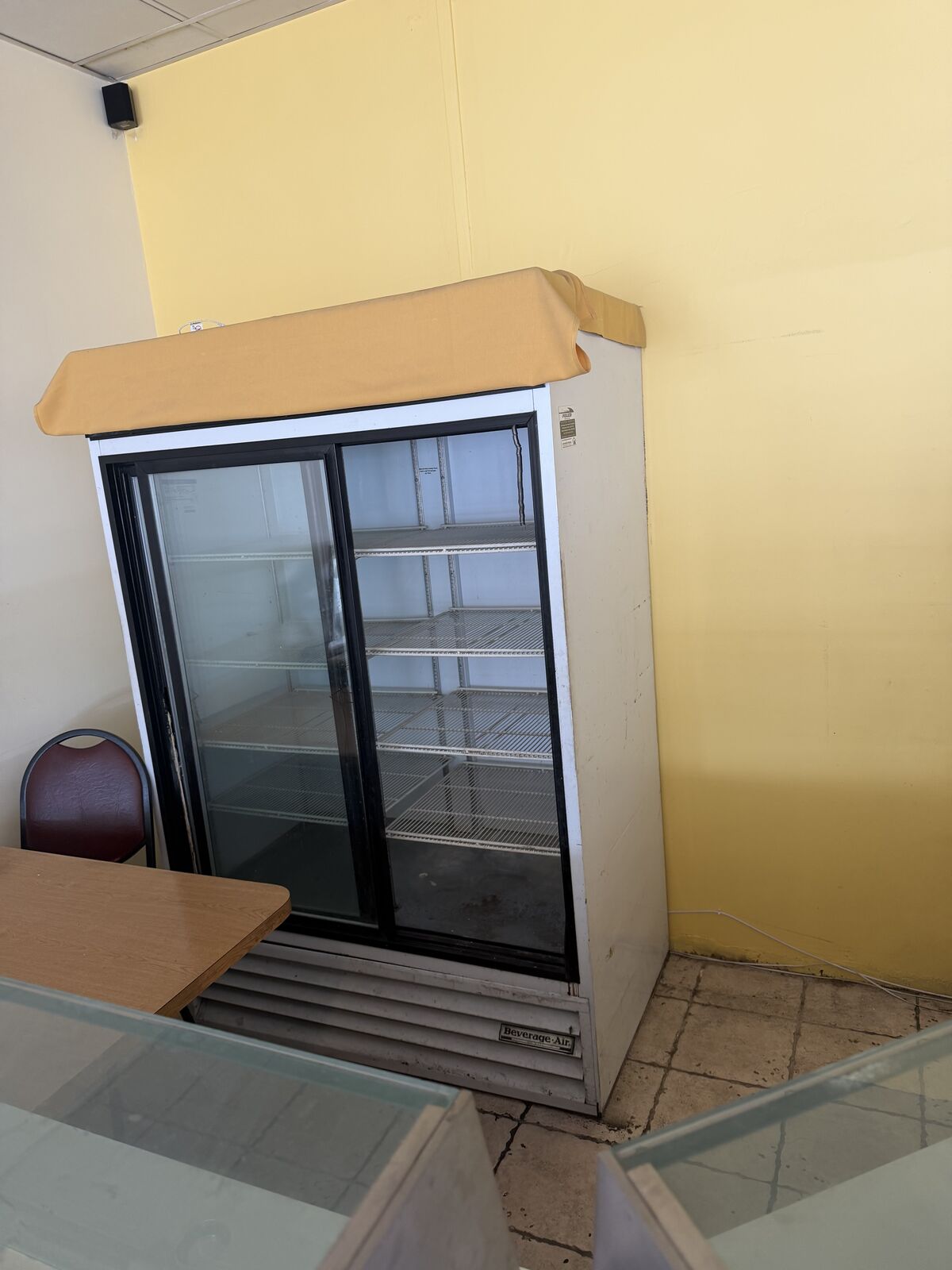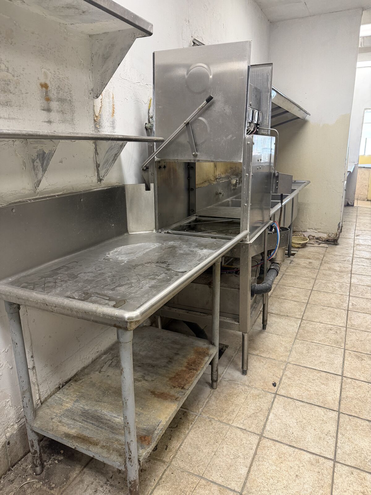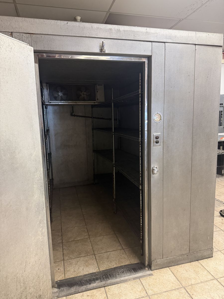 Includes: Walk-in cooler Glass-door commercial refrigerator (Beverage Air) Commercial wok range Deep fryers (Dean brand) American Range stove/oven Steam table with sneeze guard Ice machine Chest freezer Stainless prep tables & shelving Dishwashing/sink station