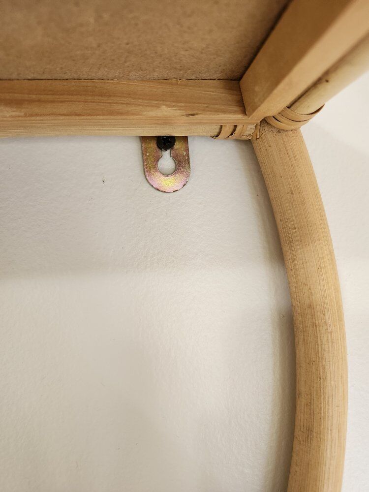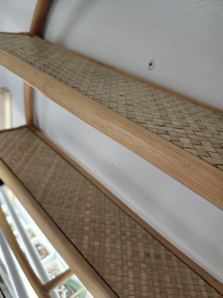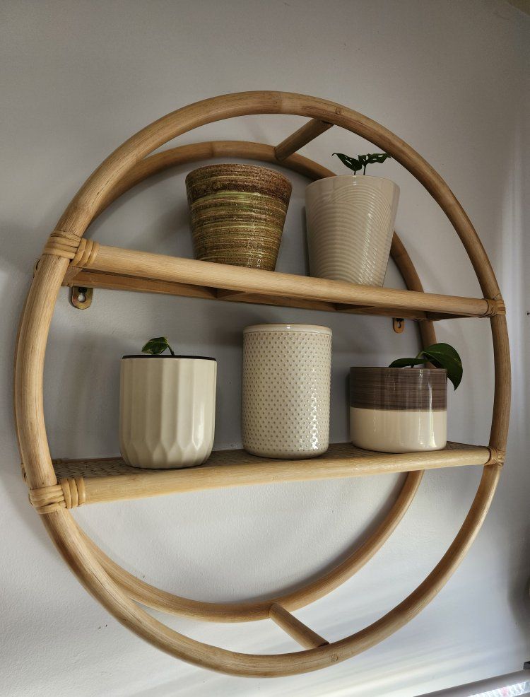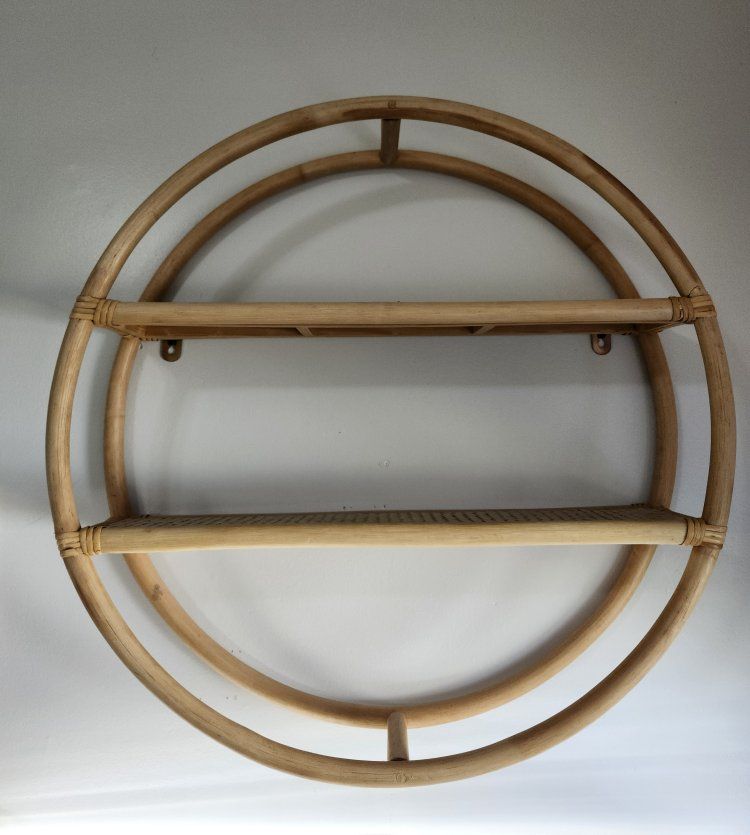 VenmoCute round rattan/bamboo wall shelf with two shelves. Sturdy, lightweight and in good condition (no cracks or structural issues). Includes screws and wall anchors, so it’s ready to hang right away. Perfect for plants, small decor, nursery items or an entryway. Neutral boho style that works well in small spaces.