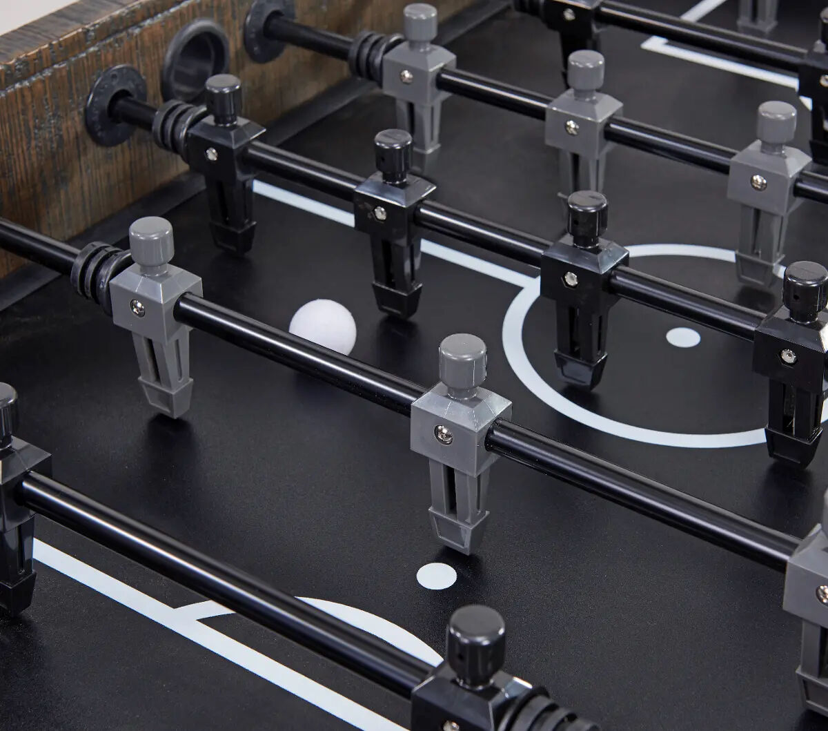 • Includes 4 balls • Black & white playing surface • Dual inset manual score keepers • Adjustable leg levelers for a perfectly even playfield • Seamless steel rods for smooth, fast action • Two ball returns for quick gameplay