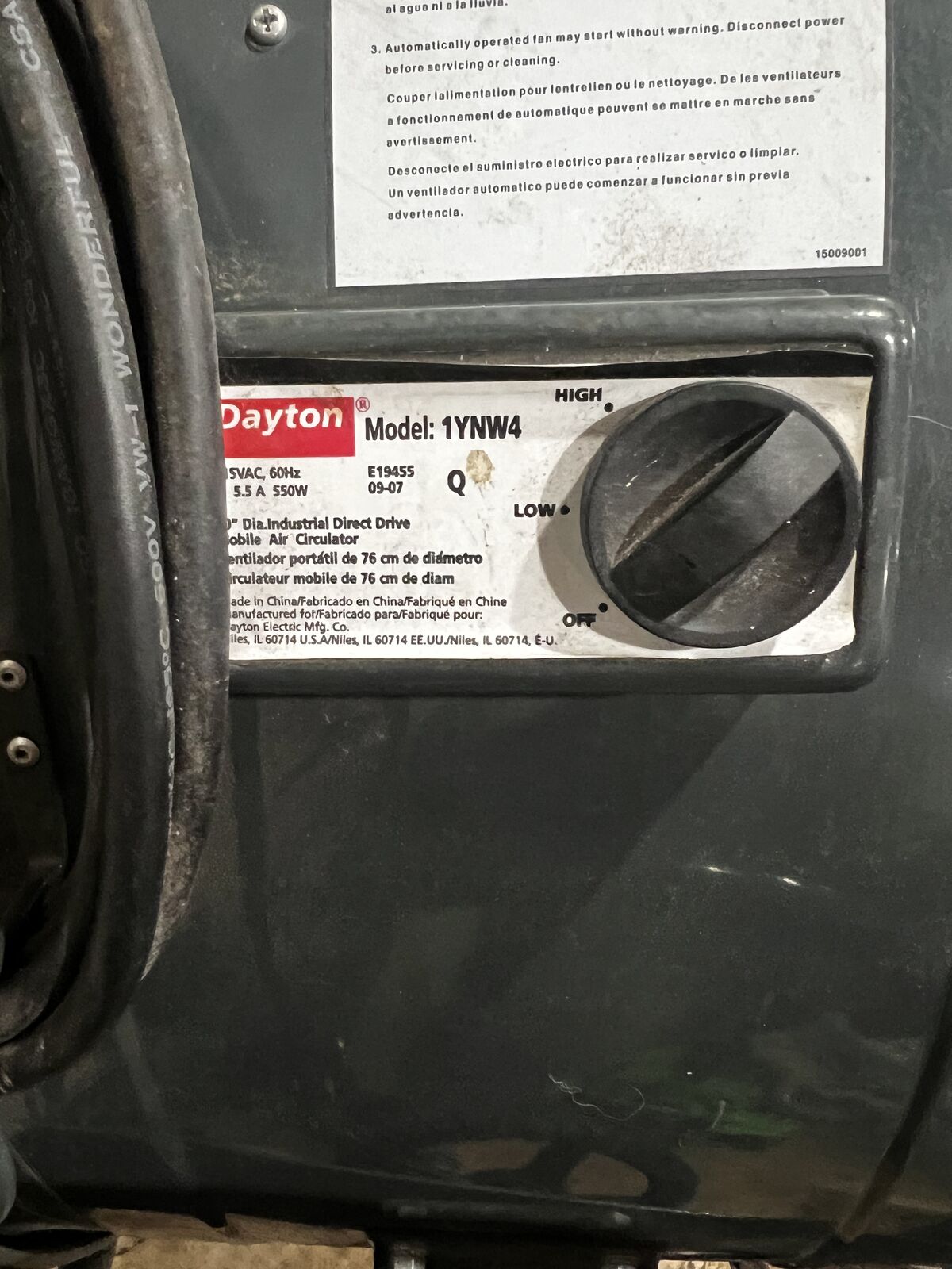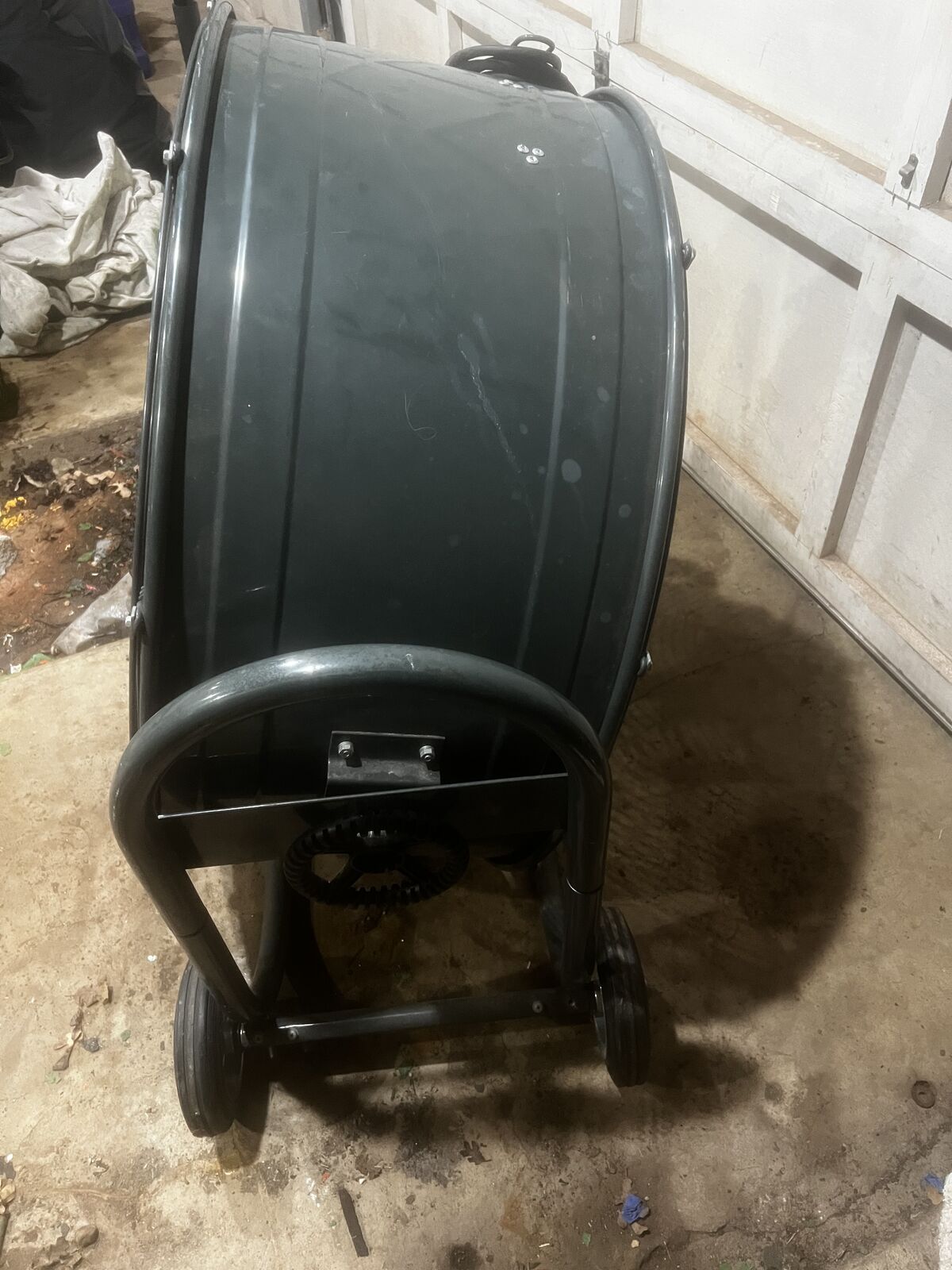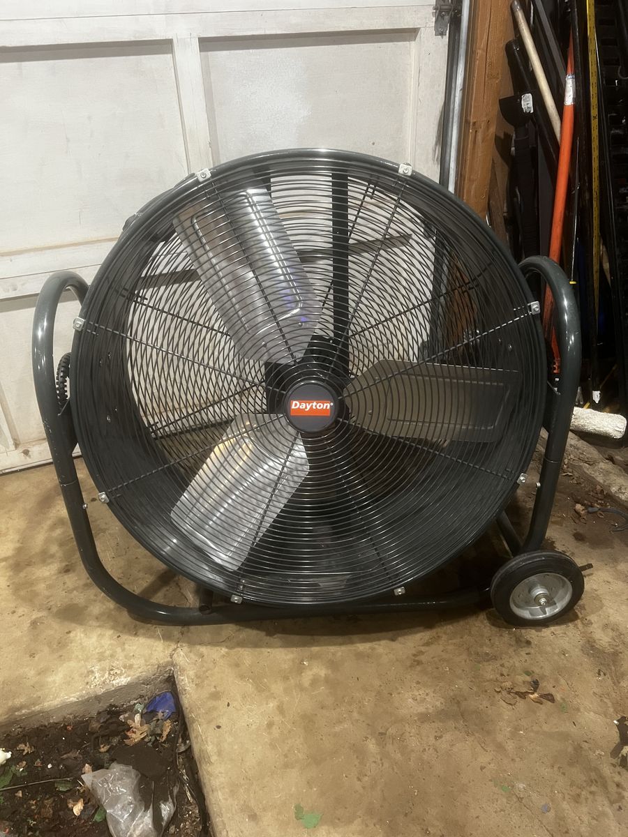 VenmoDayton 30” diameter fan with wheels for easy moving around. It features a 1/3 HP motor, producing 4,700-6,900 CFM, a non-oscillating design, a 9-ft cord,