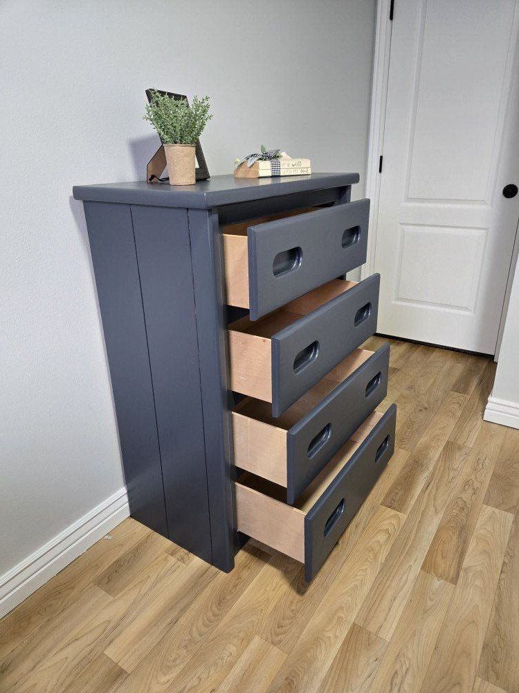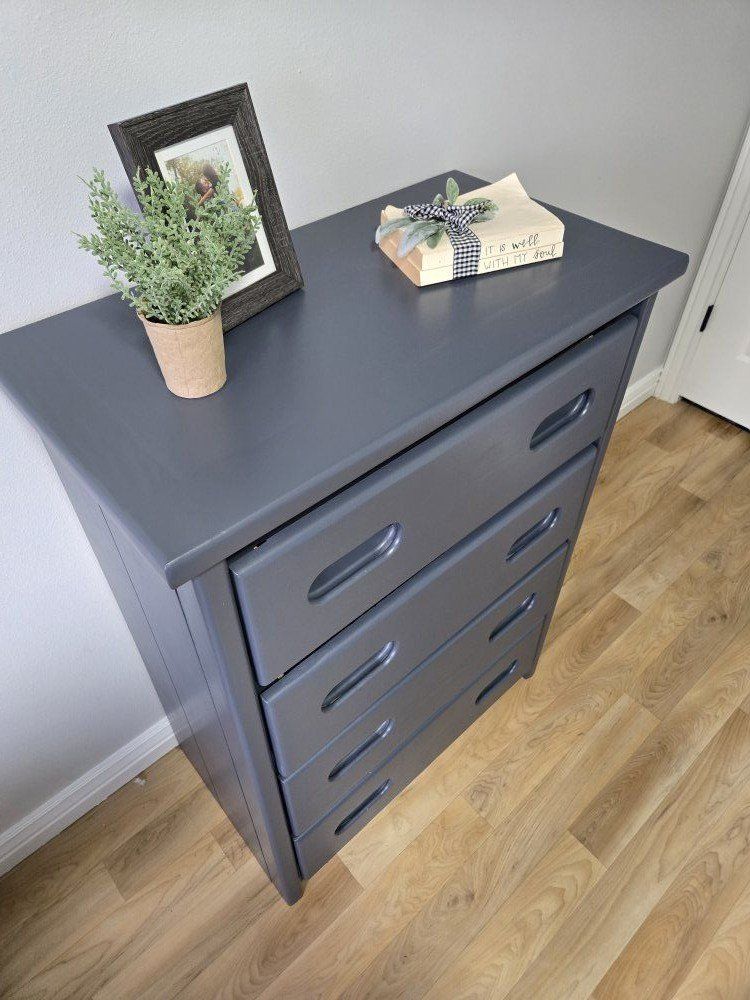 VenmoBeautiful solid wood dresser, fully refurbished and professionally finished with Benjamin Moore Advance in Hale Navy for a smooth, durable, furniture-grade finish. Clean lines and a versatile size make it perfect for a nursery, bedroom, guest room, or entryway. • Solid wood construction • 4 smooth-gliding drawers • Freshly refinished • Modern, timeless navy with a soft satin sheen This piece has been thoughtfully restored, not rushed — built to be used daily and last for years. Great statement piece that works with both modern and traditional spaces. Dimensions: 43.5" H x 32.5" W x 17.5" D