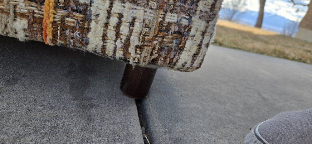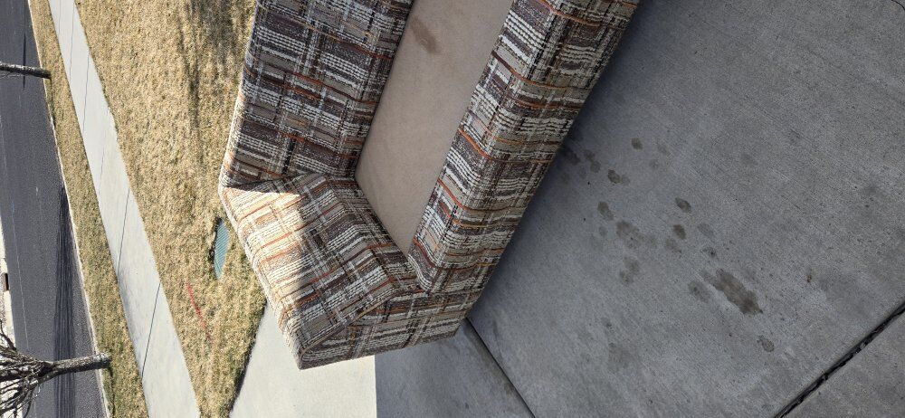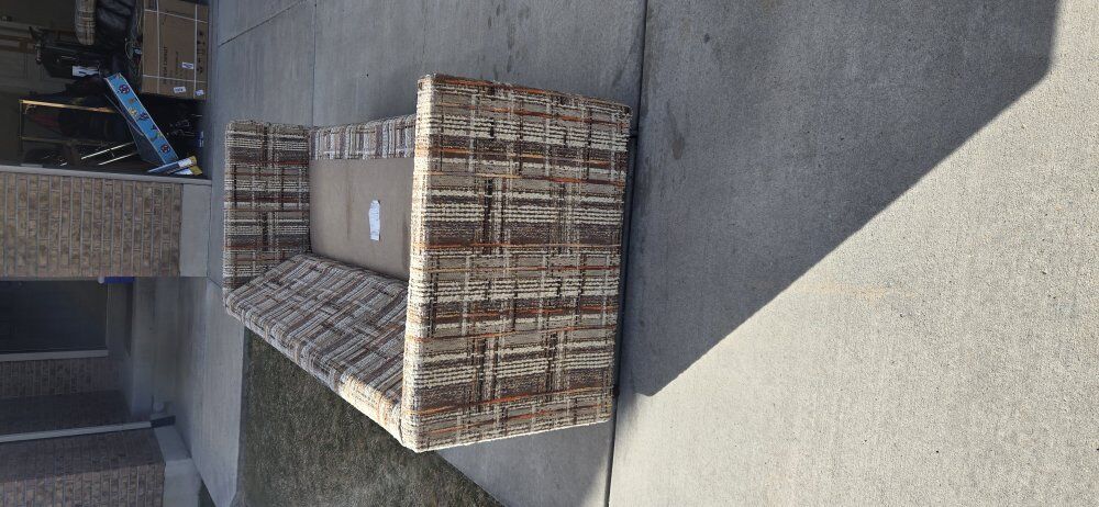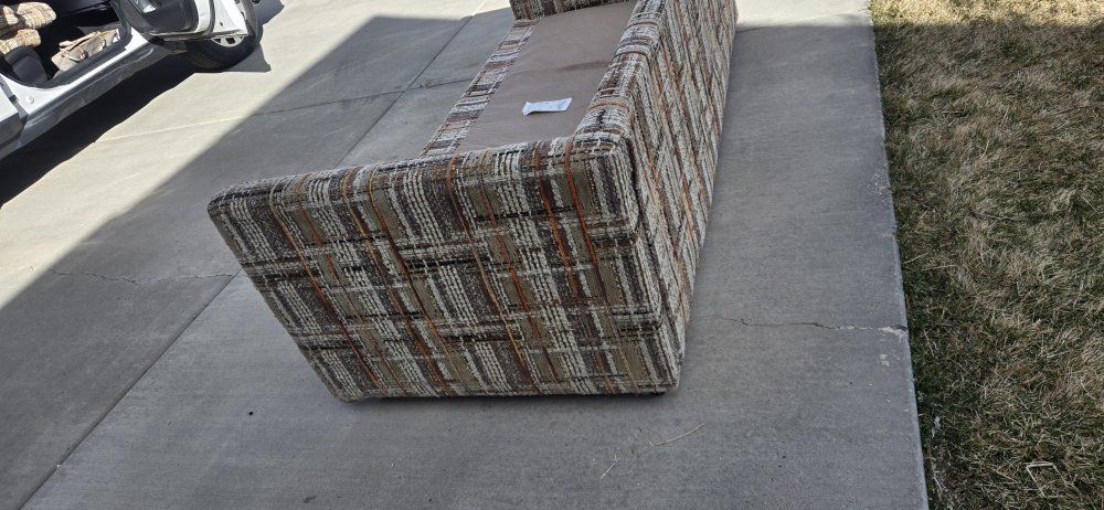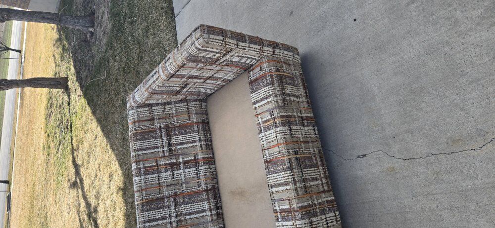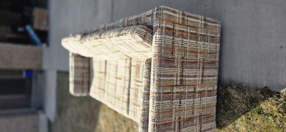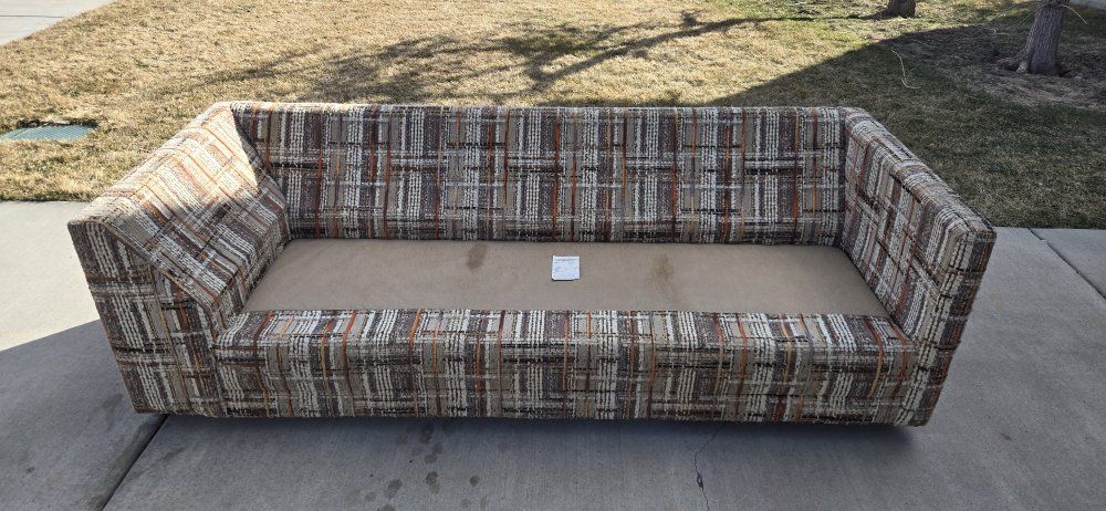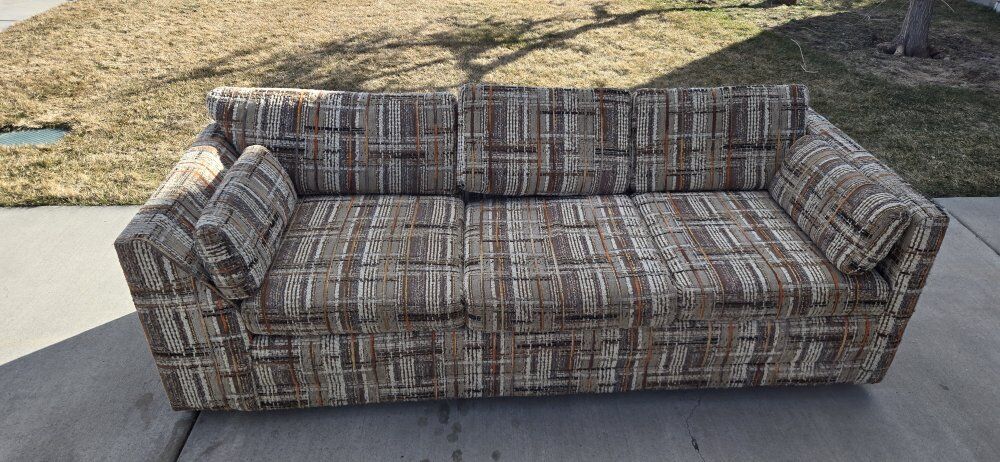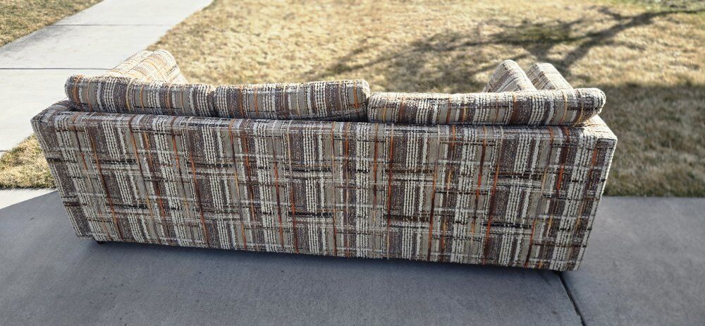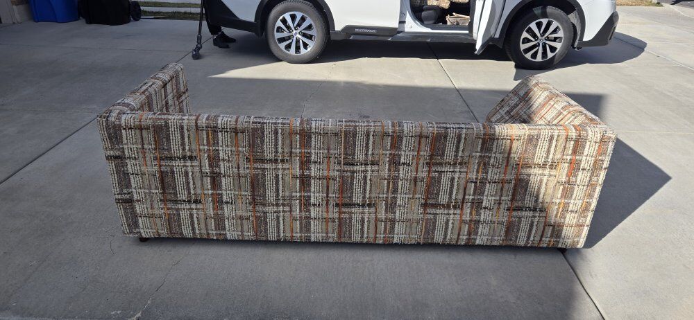 Venmothis is a vintage 1970s tweed upholstered sofa. It is characterized by its plaid-style pattern and "tuxedo" design, where the arms are the same height as the back. wet spots are water. 7ft long 34"deep 26" hieght It does not include pillows in the measurement of the height.