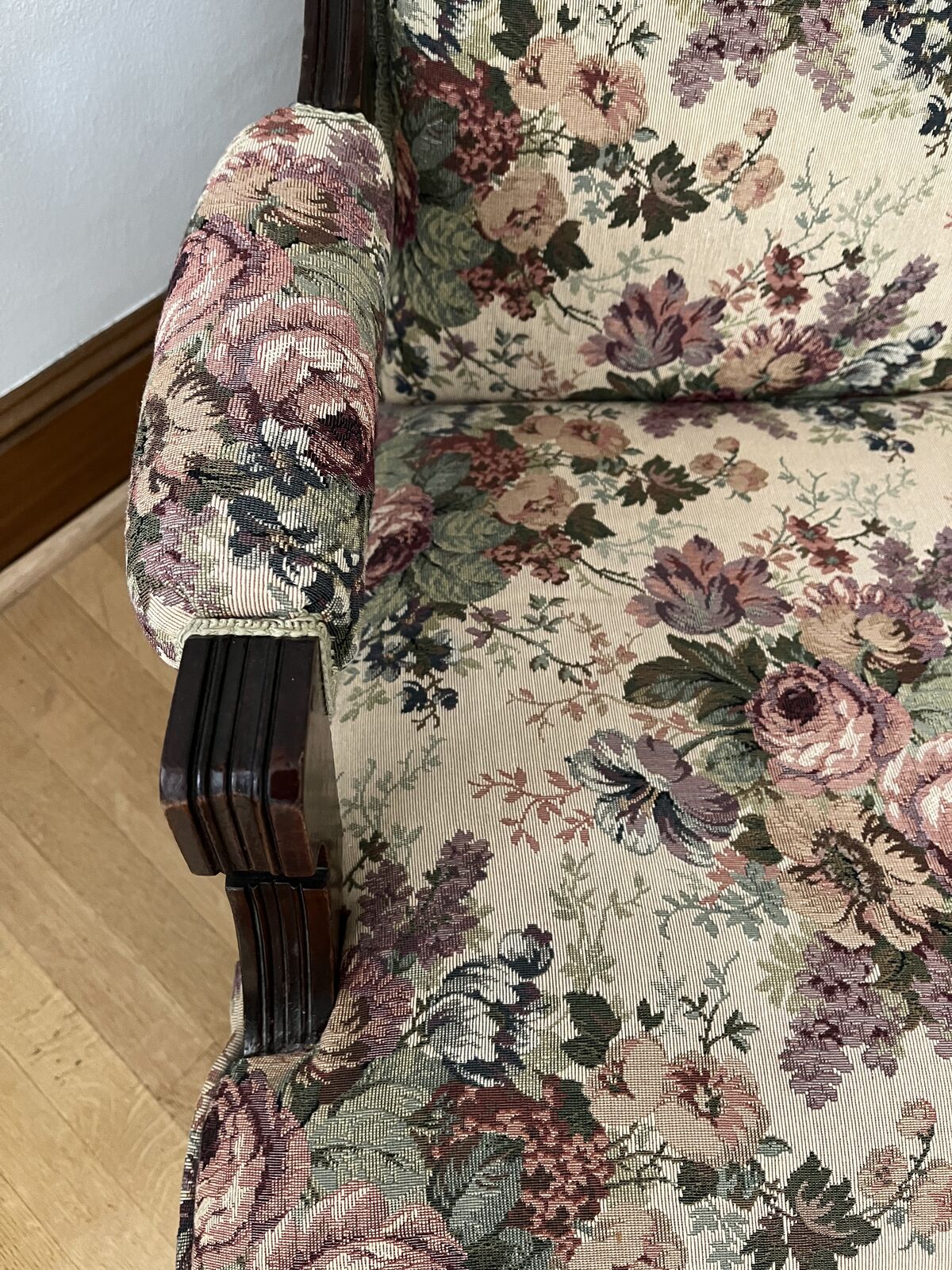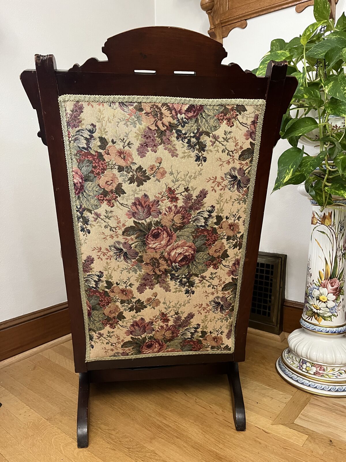 VenmoThis is a stunning rocking chiar. It is in excellant condition. The walnut wood is decorative and beautiful. The upholstry pattern has all different colors in it, that will compliment any room. This is 39 inches tall x 25 inches wide. The rockers are 25 inches deep. The seat is 19 inches deep. The back of the chair is 17 inches across. It is nicely padded and even the arms are padded. It is a must see piece. Price is firm.