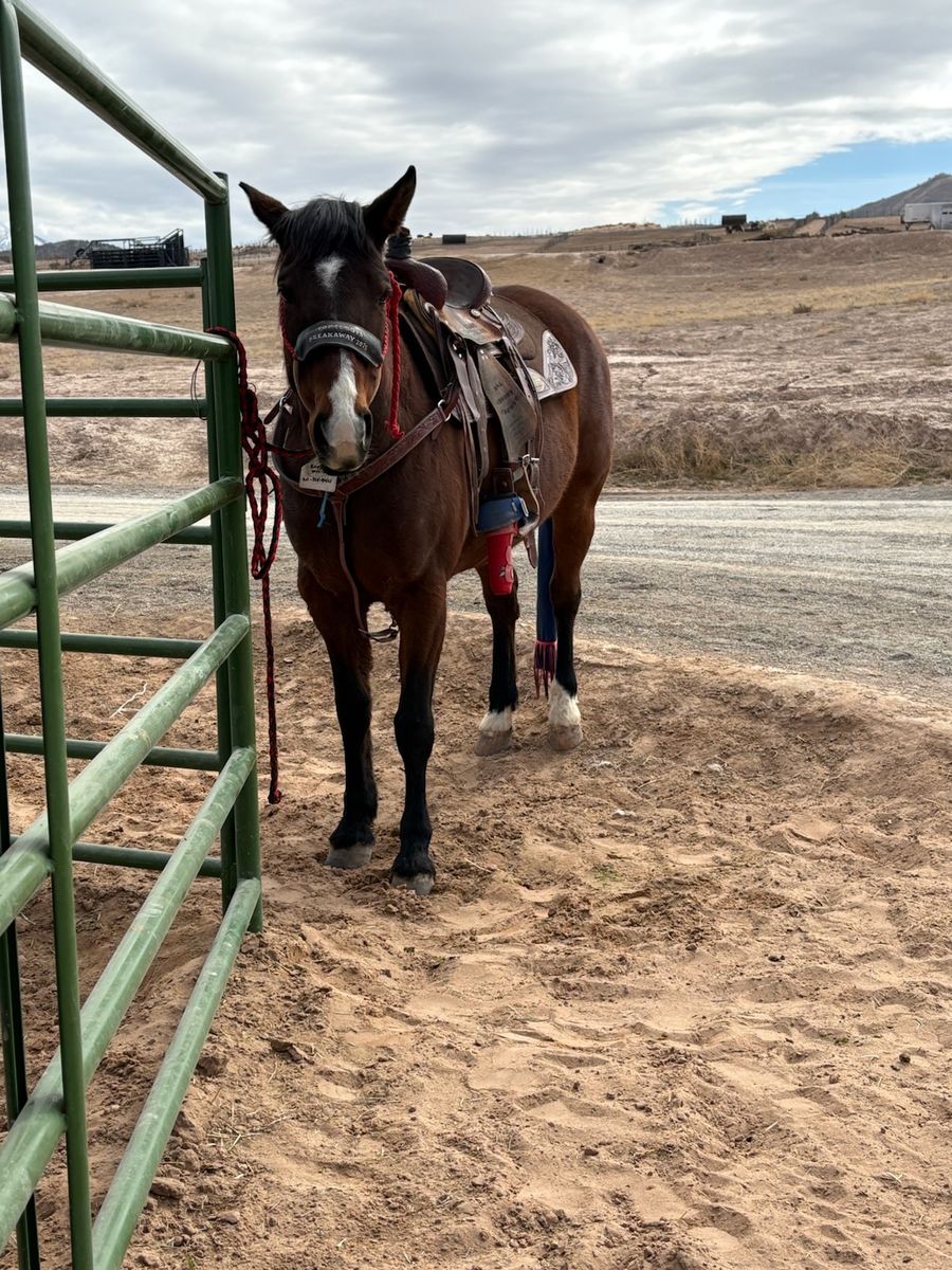 Little Deb. 7 year old, grade, bay mare.Has been ranched on and roped on.We bought her last year and the prior owners used her as a ranch and rope horse. In roping they used her to heel and breakaway. We haven’t rode her much but when we do we mostly use her for my handy 11 year old to practice breakaway.She has a good handle. I sent her with a friend who used her to gather cows and she did well.The people we bought her from said she was dead broke but I wouldn’t put a young kid on her, with that being said, we haven’t rode her a ton. She would work good as a ranch or trail riding horse. If you want more information I can send her sale video the previous owner made and a few videos I have.