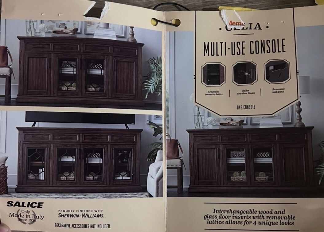 CashAppNice console Multiple inserts for front faces Great condition Back has cutouts for cords Adjustable shelves