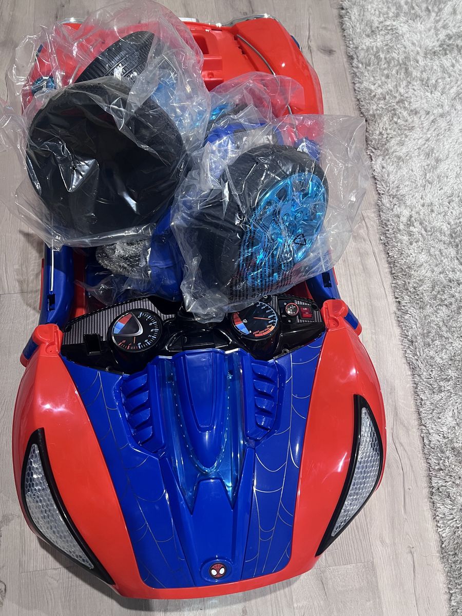 Brand new kids ride-in electric car. Bright blue and red design with sporty detailing. Never used — still in original packaging with protective plastic on parts.