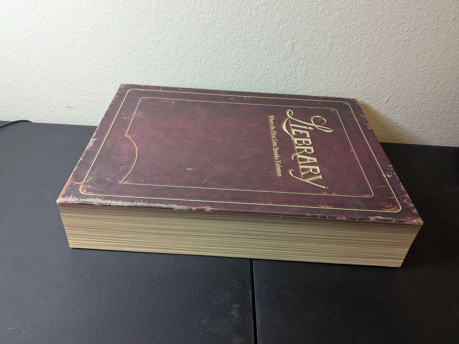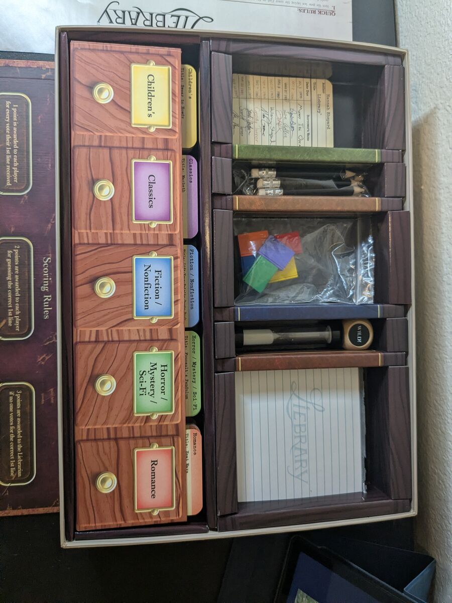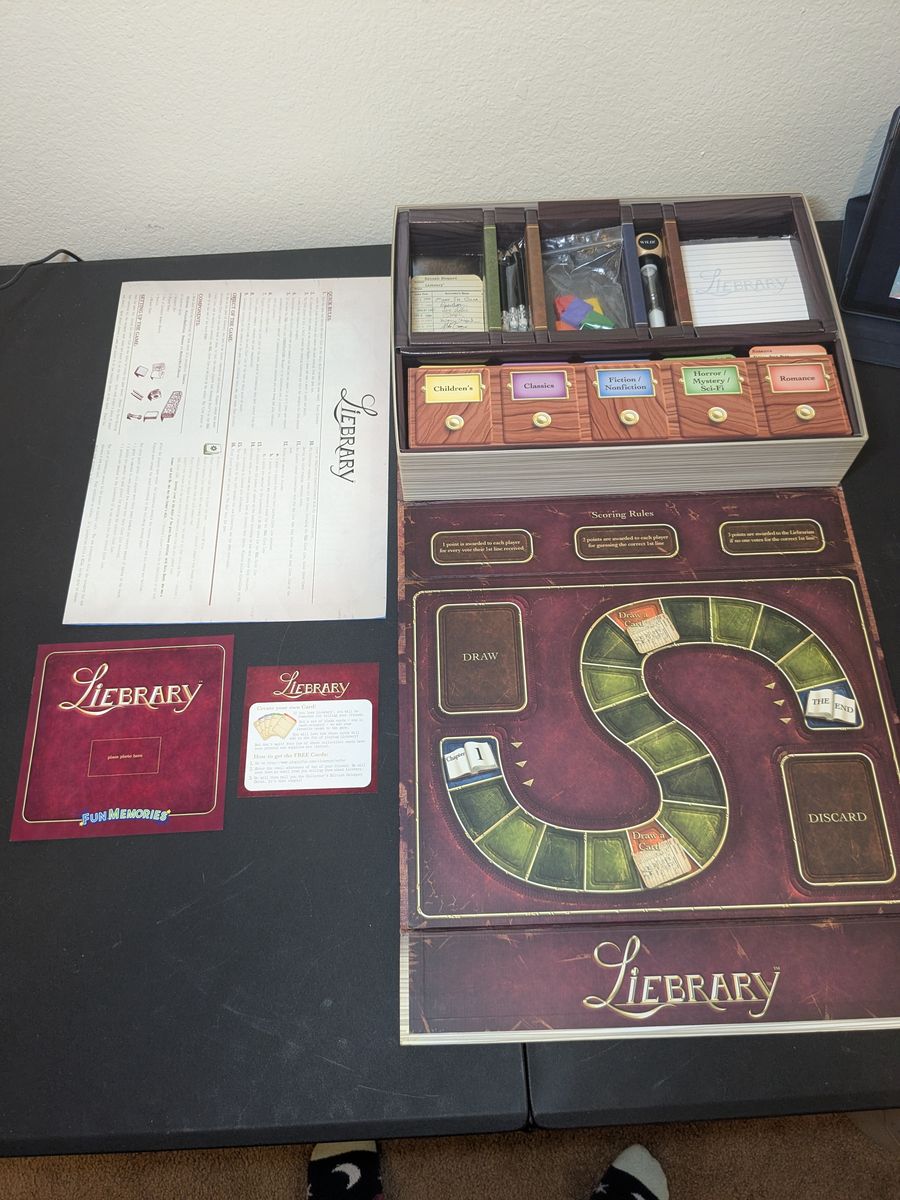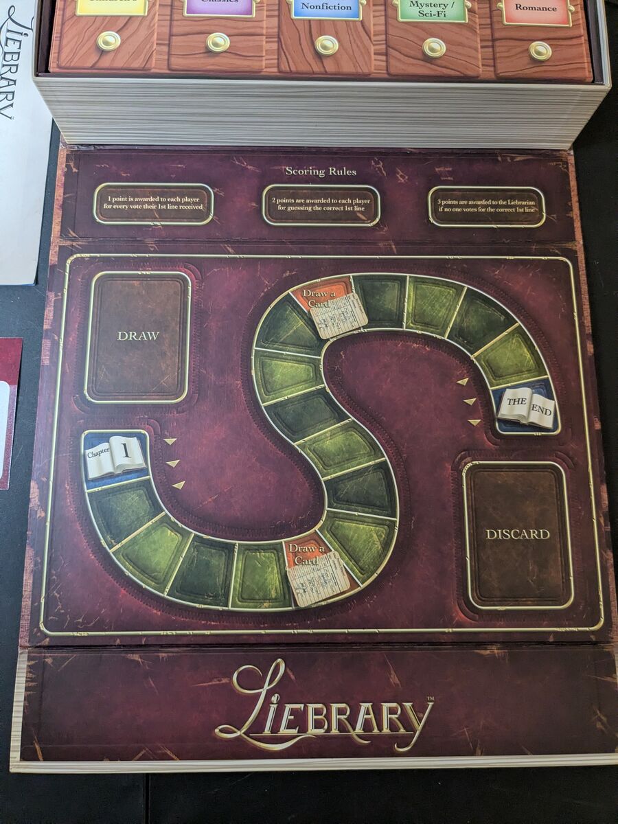 ZelleIn Liebrary, one player reads the title, author, and synopsis of a real-life book (e.g. Julius Caesar, Jurassic Park, or Mr. Brown Can Moo). The other players must each write and submit their best attempt at a first line for the book.