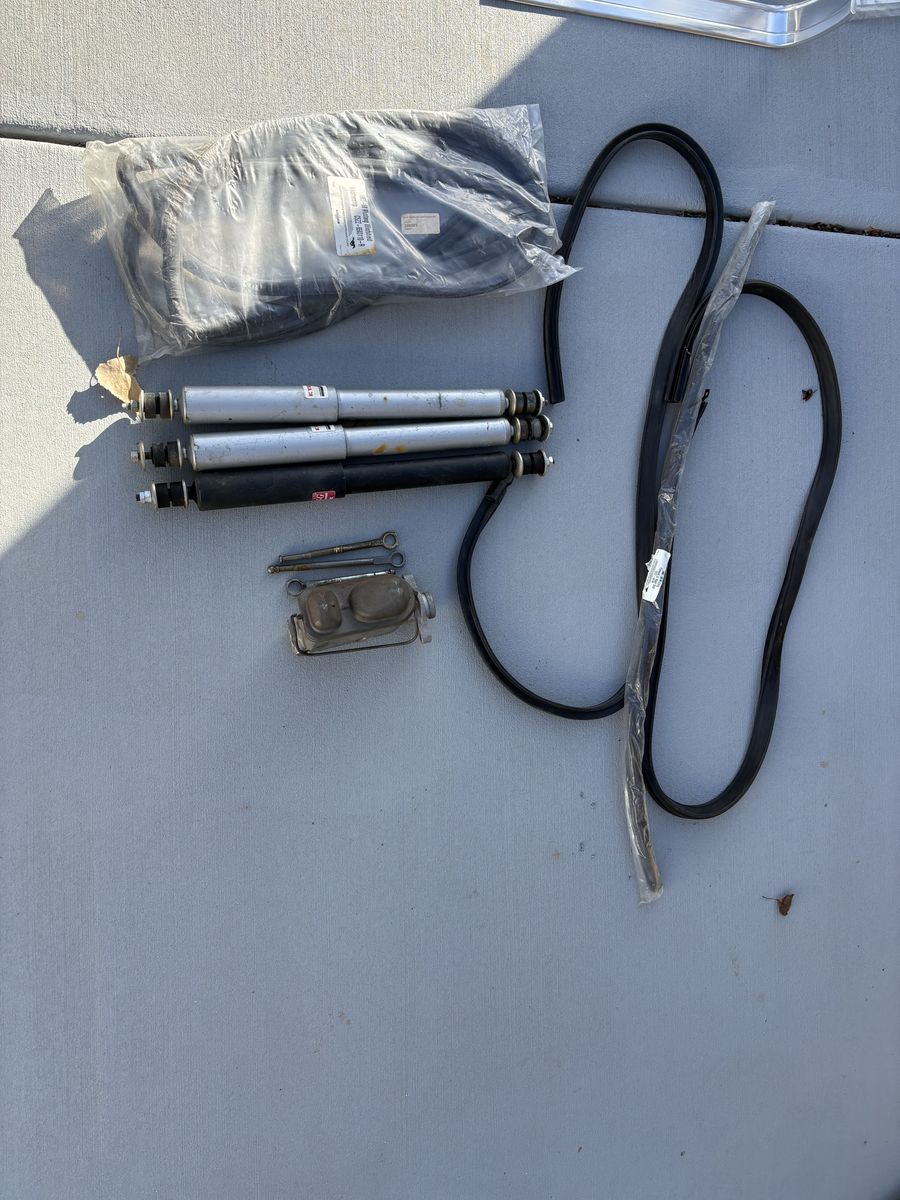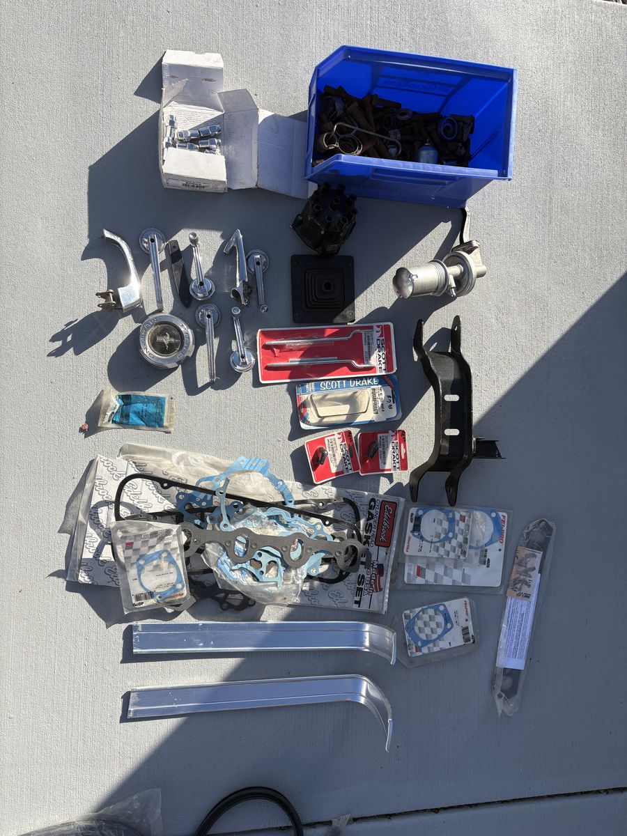 Part lot Weatherstrip Drum brake rotors Dual master cylinder Bumpers Gas cap Headers/exhaust with hardware Transmission brace Msd coil Msd ignition (power wire is not working) Fuel pump Door handles Plus more