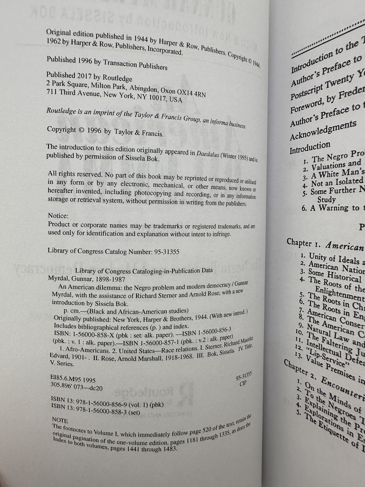 In this groundbreaking analysis, Nobel laureate Gunnar Myrdal examines the contradictions between America’s democratic ideals and the realities of racial discrimination. This Routledge edition includes a new introduction by Sissela Bok and preserves the historical and scholarly significance of the original work.