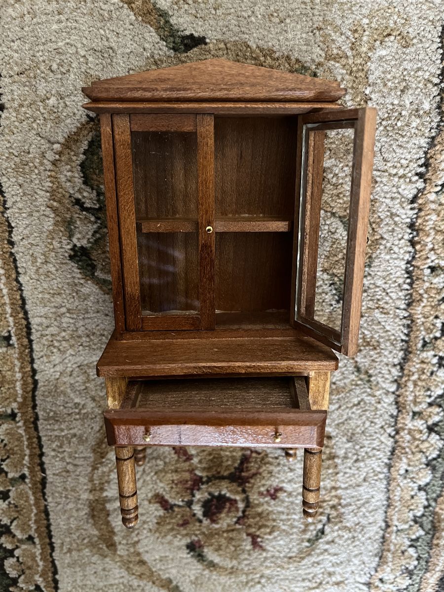 VenmoThis in in the original box. This is what the box says 'Exact replica in miniature of the famous composer's working desk'. Glass doors open and close as does the drawer. Spool turned legs. Cherrywood magnificent. It is a Stephen Foster desk. Handcrafted with a beautiful cherry hardwood. A one of a kind piece. This is the desk only, no chair. It measures 6 1/4 tall x 3 1/4 wide x 1 3/4 deep. A lovely piece that appears to have never been used. Must see. Price is firm.
