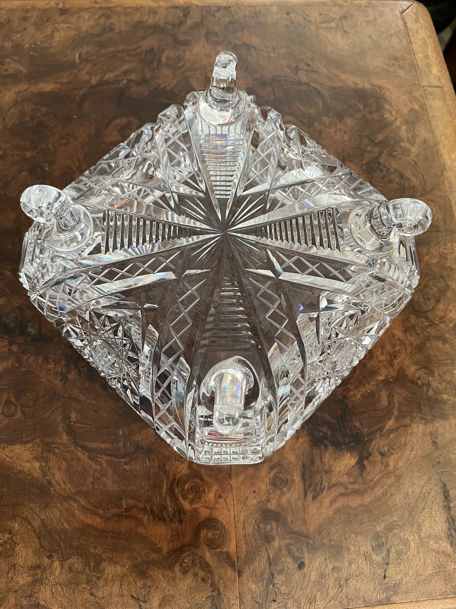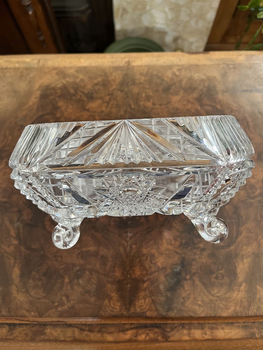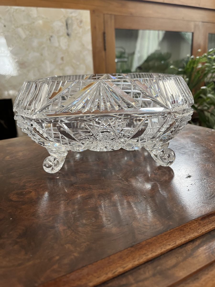 VenmoThis is one gorgeous and stunning piece of crystal. If you love quality, this is for you. Way to pretty to put in a china cabinet. It needs to be displayed. It is a heavy quality piece of crystal. It has a star and diamond pattern to it. Simular to the American Brilliant pattern. The top goes in slightly, for added detail. It measures 7 1/2 inches across x 4 inches tall. It sits on four curved and curled feet. I'm cleaning out some of my mom's treasures.This lovely piece she hand carried home from Ireland, along, long, time ago. Come and see this. You will love it! Price is firm.