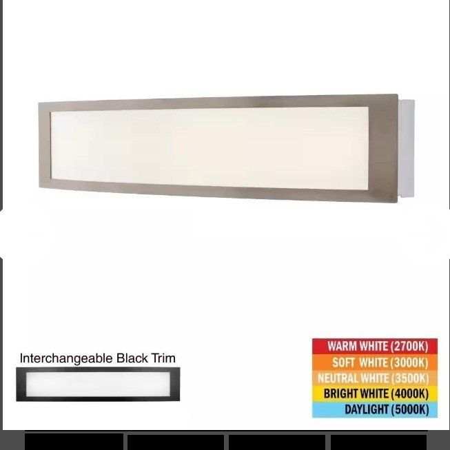 VenmoRefresh your home decor with this 24 in. Woodbury Brushed Nickel LED Vanity Light with interchangeable Matte Black trim by Hampton Bay. Prior to installation, select your desired color temperature of light output from 2700K Warm White to 5000K Daylight. The versatile design allows you to mount this horizontally or vertically. It works well above or to the side of vanity mirrors, dressing rooms, lounges, closets and other areas. The LED design makes this virtually maintenance-free since there are no bulbs to replace.. Five selectable color temperatures 2700K 3000K 3500K 4000K 5000K. Mount horizontally or vertically for a versatile LED vanity light. Great for vanity mirrors, dressing rooms, lounge, closets, stairs. Actual Color Temperature (K): 2700,3000,3500,4000,5000. Color Rendering Index (CRI): 90. Color Temperature: Adjustable White. Damp/Wet Rating: Damp Rated. Features: Light Bar,Multi Mounting Positions. Fixture Color Family: Nickel. Fixture Color/Finish: Brushed Nickel. Fixture Material: Metal. Included: Mounting Hardware. Light Bulb Type Included: Integrated LED. Lumens: 1600. Mounting Position: Non-Directional. Number of Lights: 1. Power Source: Hardwired. Recommended Vanity Size (in.): 26. Shade Color Family: Nickel. Shade Material: Acrylic. Shade Shape: Rectangular. Wattage (W): 25 W. Fixture Height (in.): 3.86 in. Mounting Plate Height (in.): 4.7 in. Mounting Plate Width (in.): 4.7 in. Product Depth (in.): 5.20 in. Product Width (in.): 24 in.