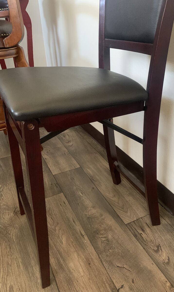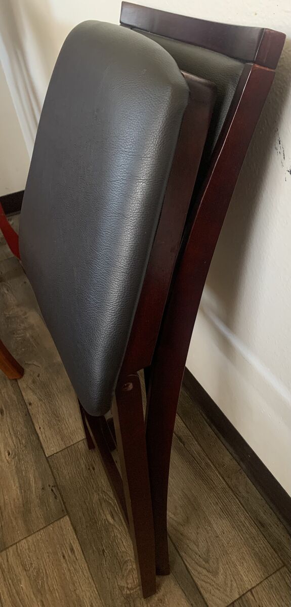 VenmoLike new Beautiful foldable chair with faux leather seat and back rest. Beautiful merlot wood. Nice chair for a desk, table ect Measurements in pics Can deliver
