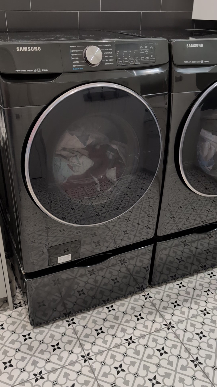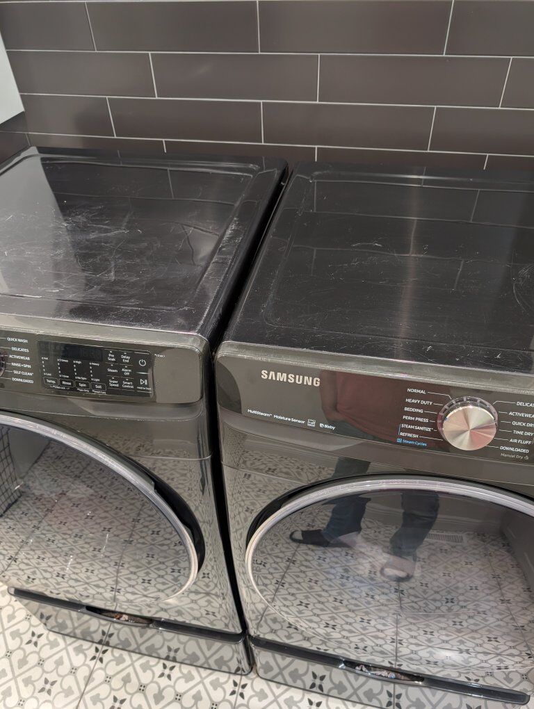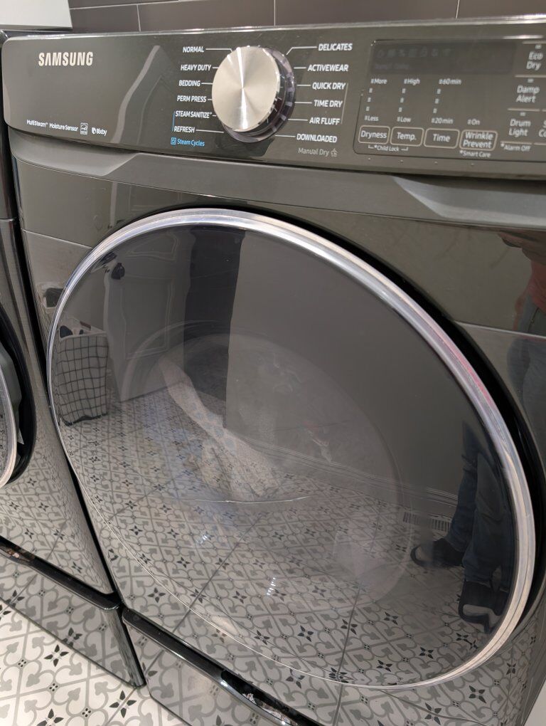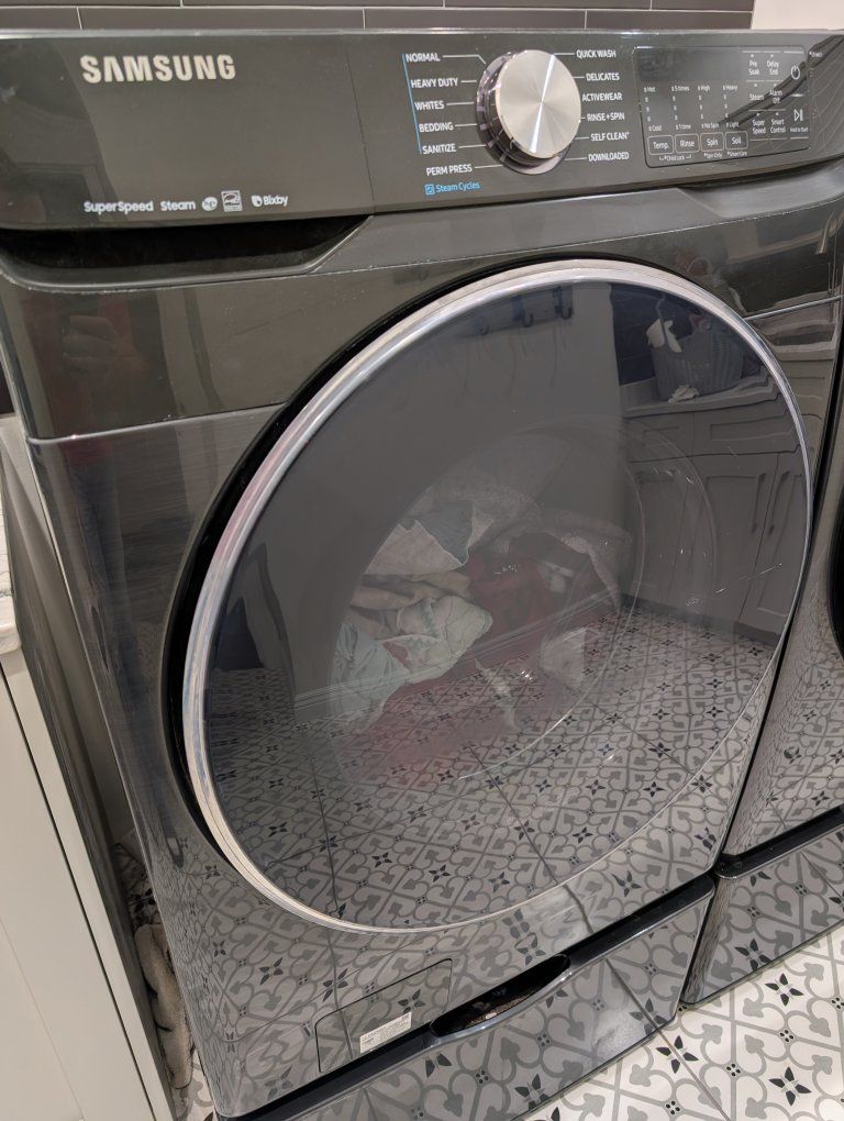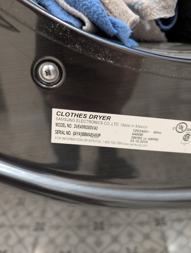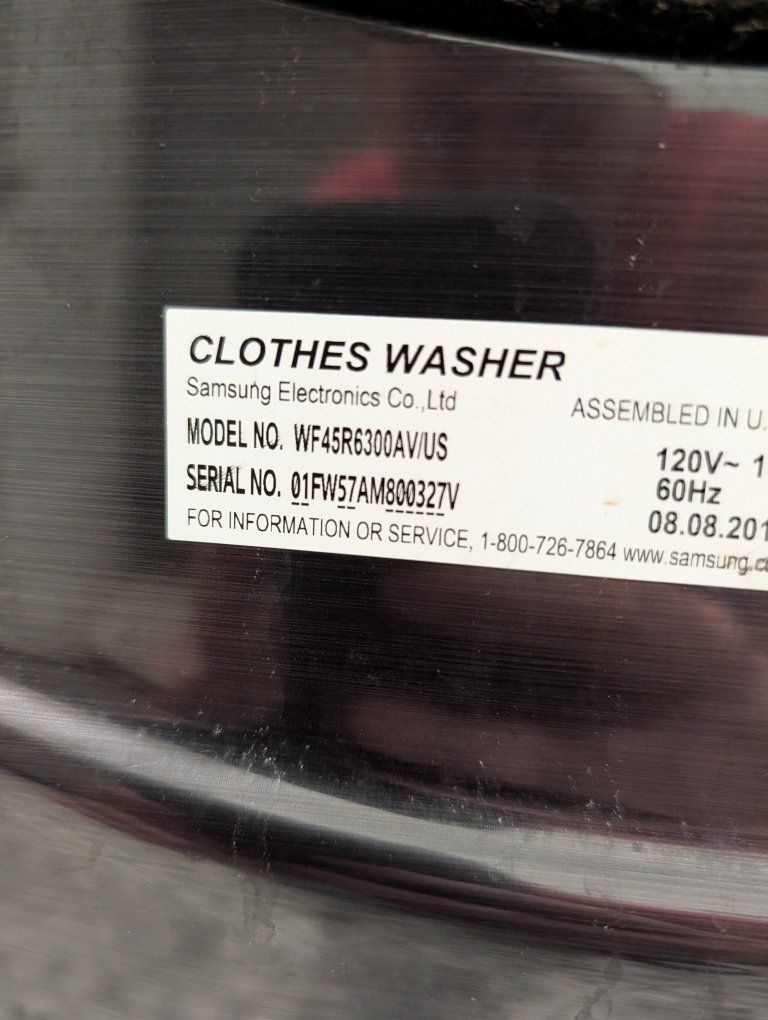 BONUS: Matching washer included FREE if you want it (Model WF45R6300AV). Washer still washes well but makes knocking noise during spin cycle — likely needs suspension parts if someone wants to repair it. Including the model number so buyers can look up parts or repair info ahead of time.