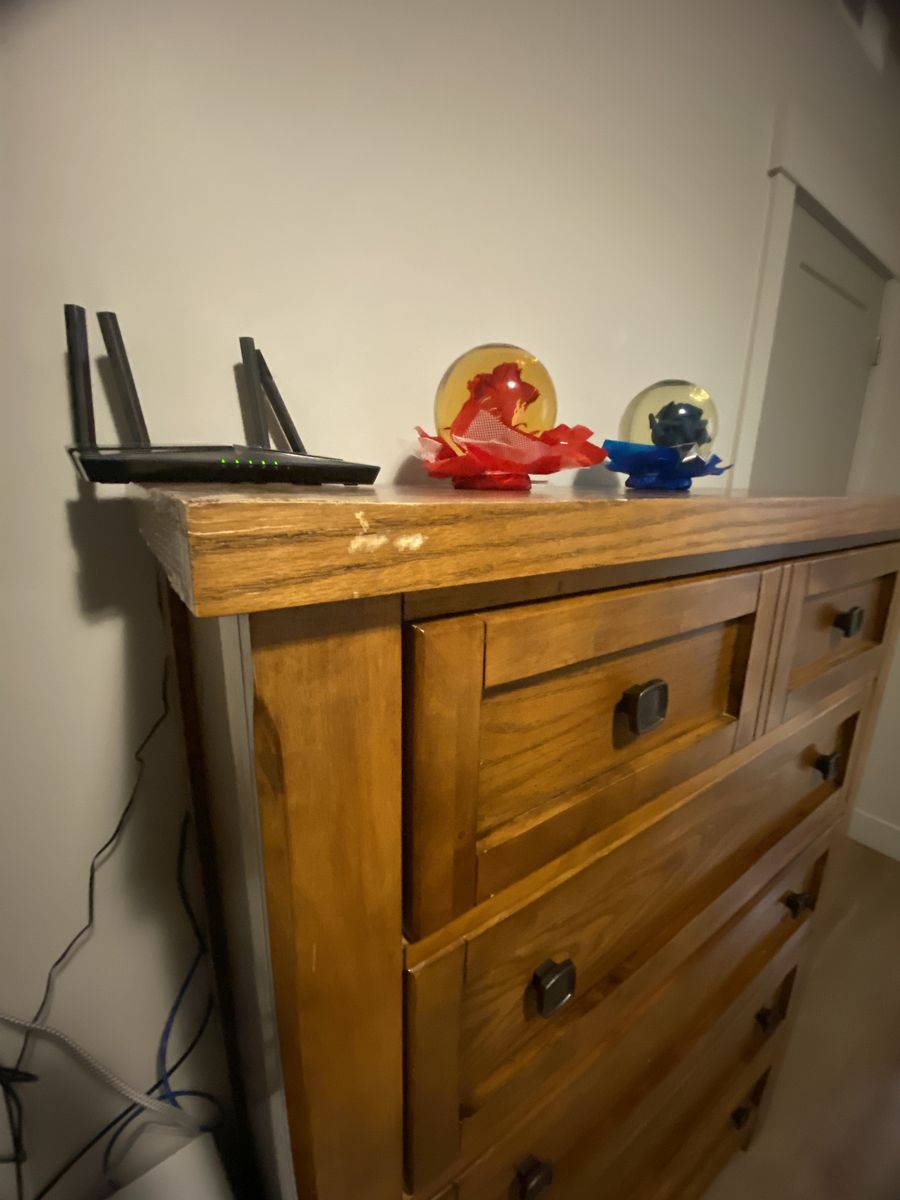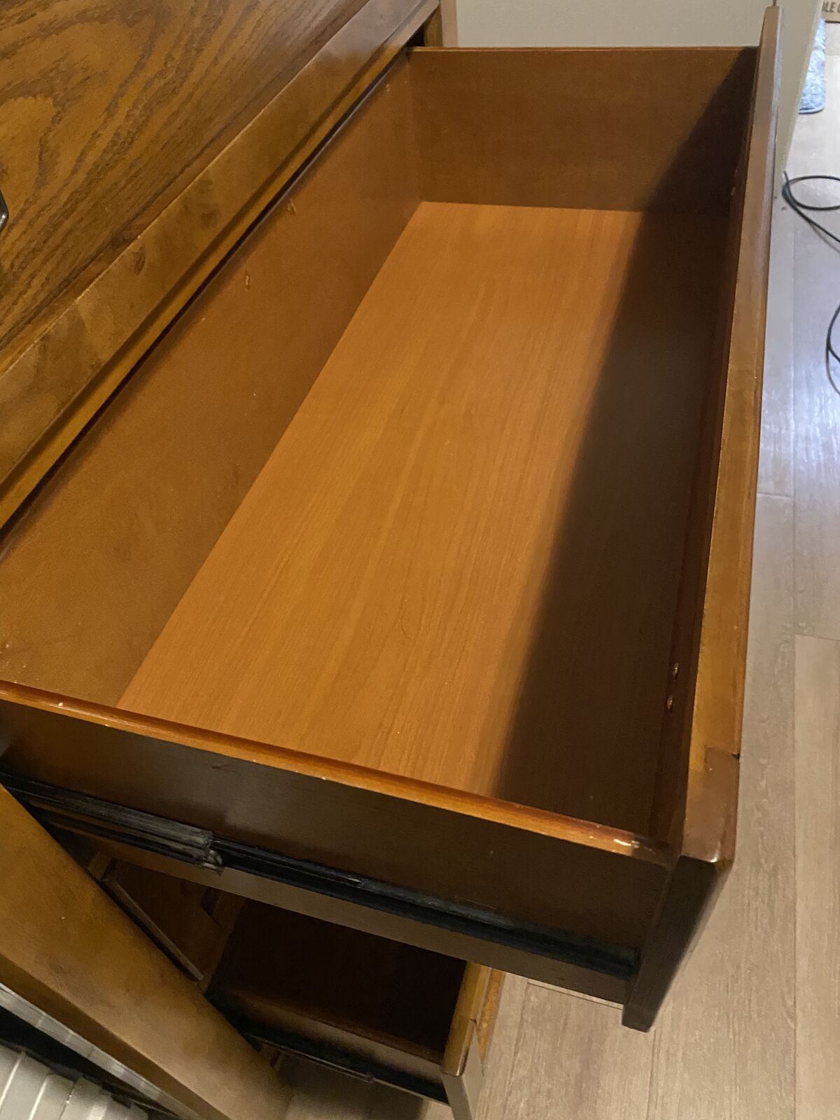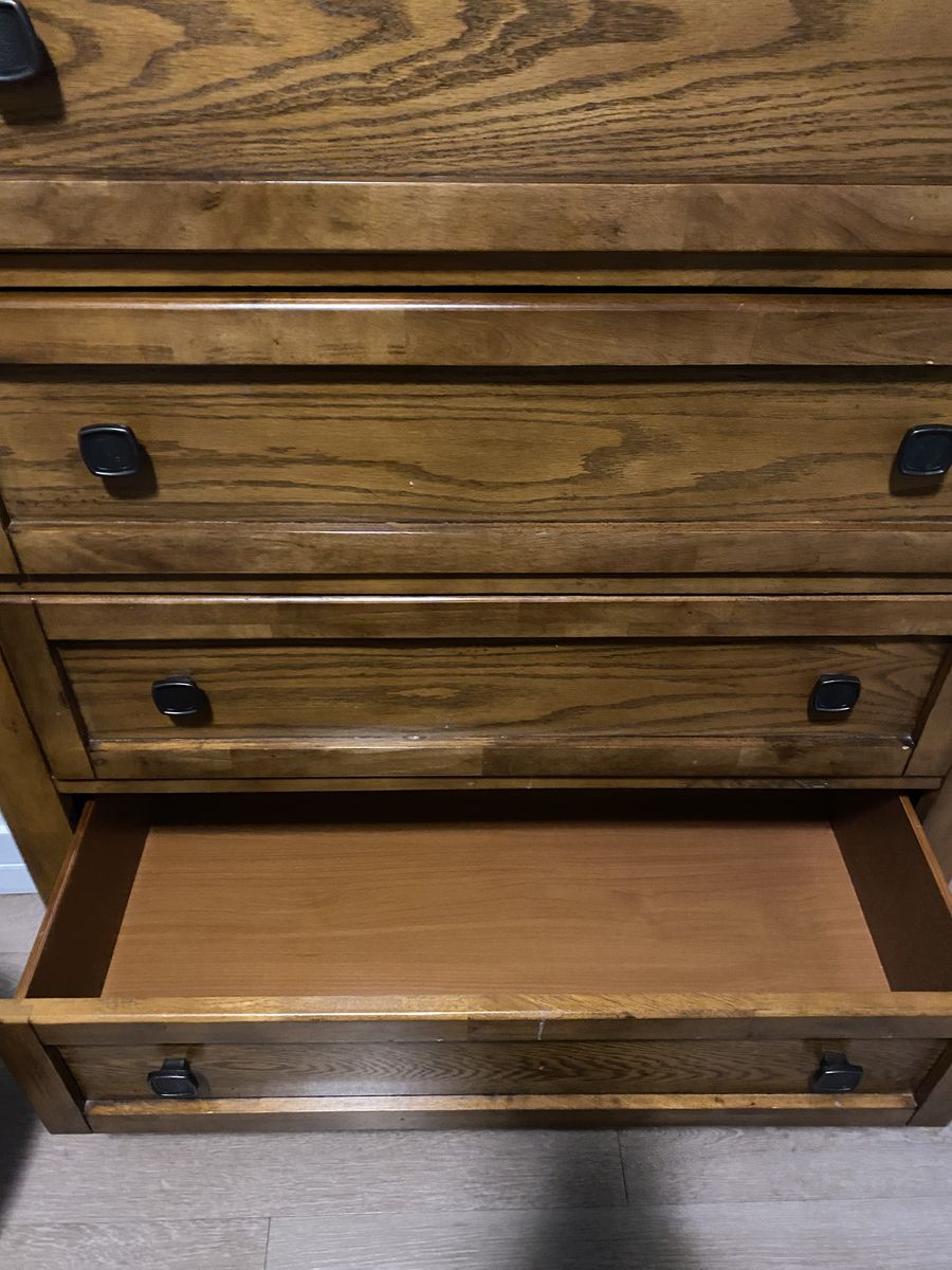 Beautiful solid wood dresser in great condition. Warm medium-brown finish with black hardware and a clean, classic design.