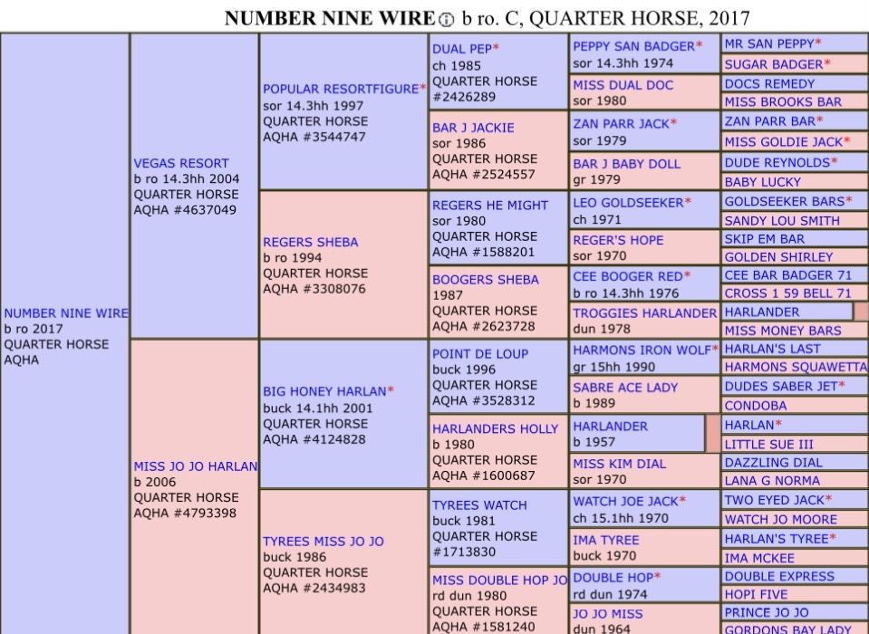 NUMBER NINE WIRE’s grand-sire, POPULAR RESORTFIGURE, "Pop Tart" is the 2002 AQHA Superhorse with multiple world championships. Sire of many NFR Tie Down horses ridden by the top PRCA ropers. The dam of "Pop Tart" is the great mare, Bar J Jackie. She has a World Championships in Heading and Tie Down Roping and has 1,127 AQHA Performance Points in 6 events. Her sire is Zan Parr Jack, who will be inducted into the AQHA Hall of Fame in 2020. Dual Pep is a NCHA Futurity Champion. Regars Sheba has 1650.5 AQHA points. Regers He Might is a World Champion and a World Champion producer. Boogers Sheba, Top 10 Tie Down Roping High Point, is a daughter of Cee Booger Red and out of the Harlander mare Troggies Harlander.