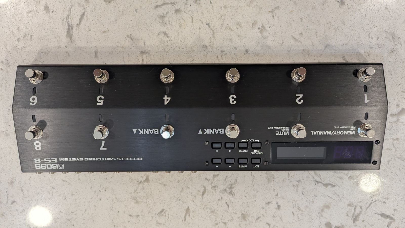 The item pictured is a Boss ES-8 Effects Switching System. This device offers advanced control over multiple guitar effect pedals, allowing musicians to create and instantly recall complex effect chains.