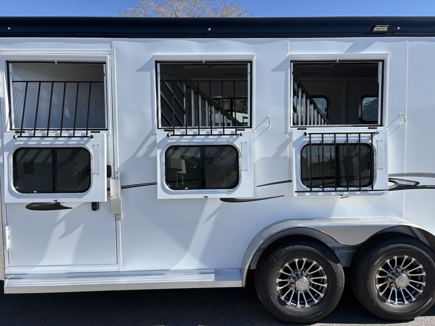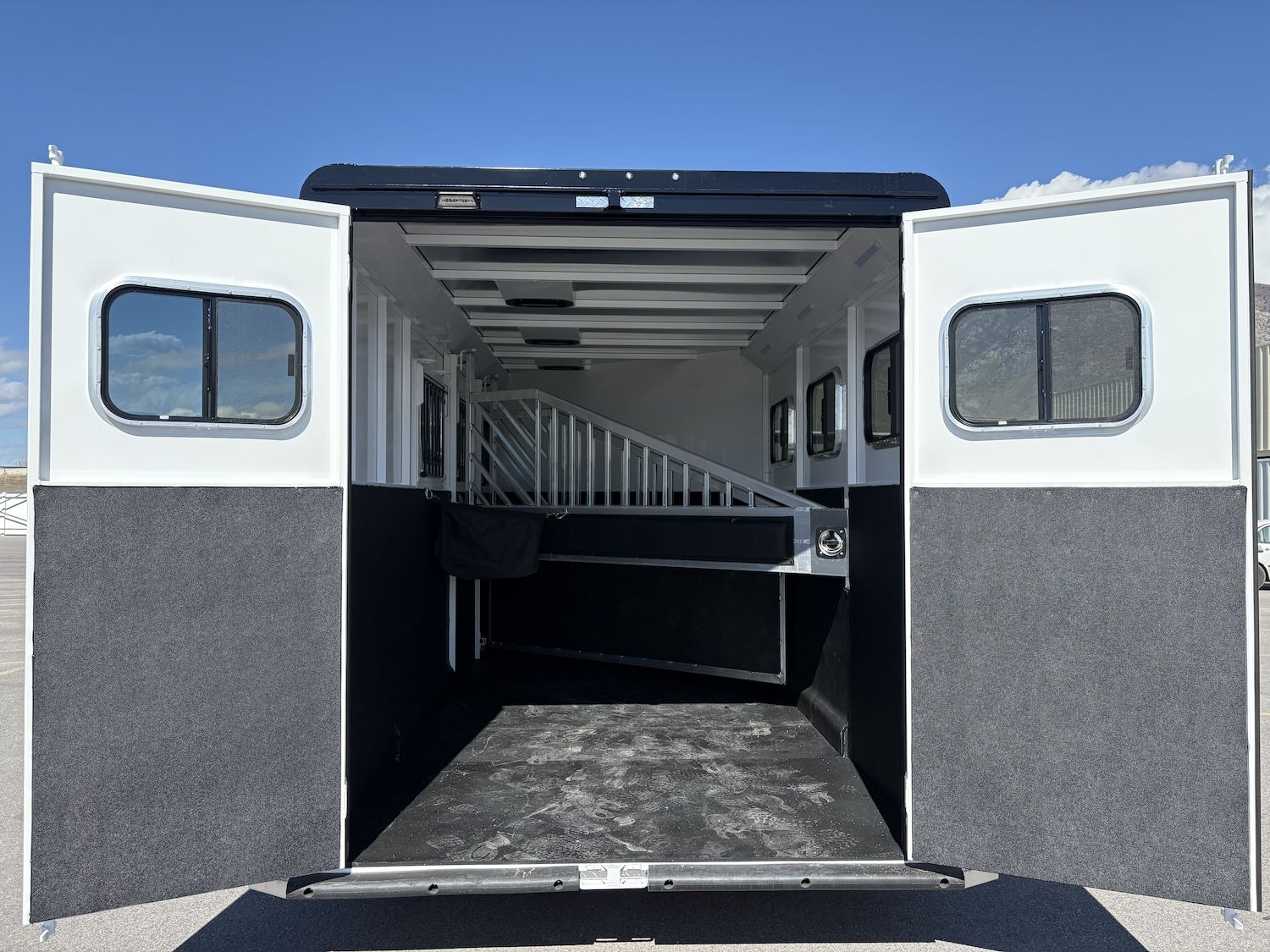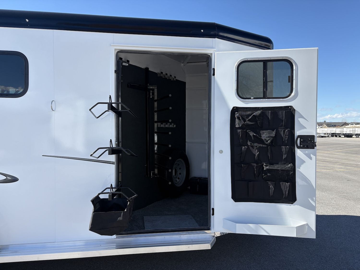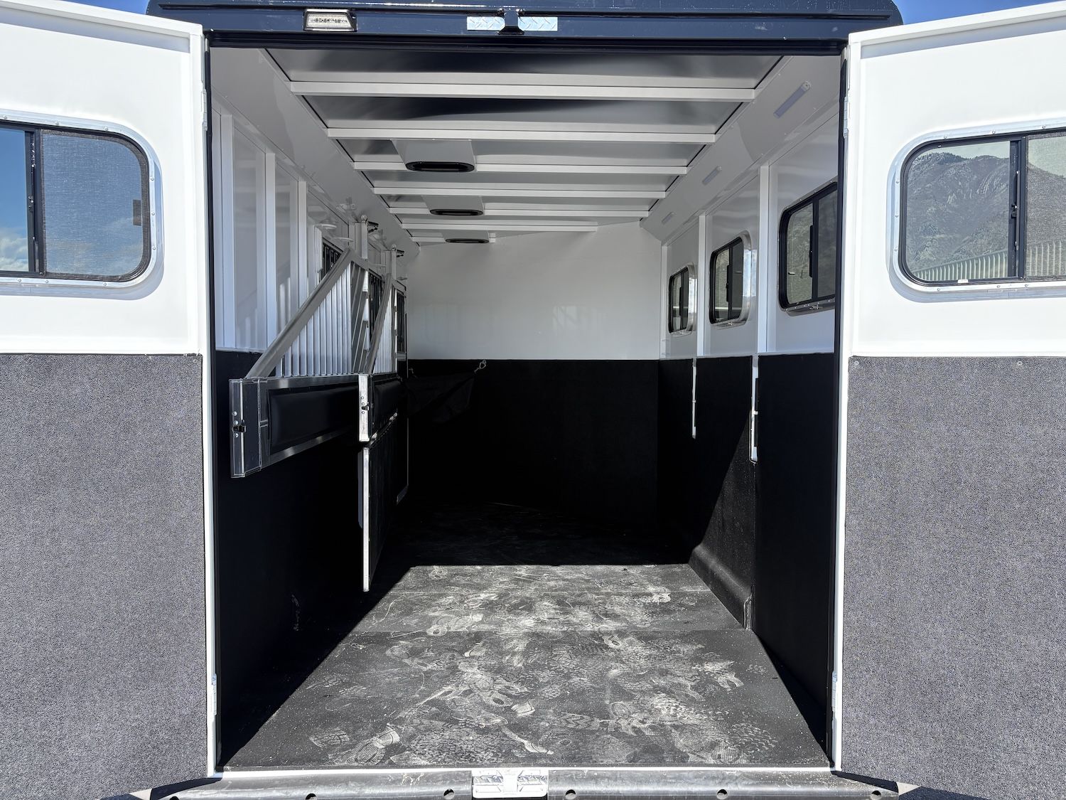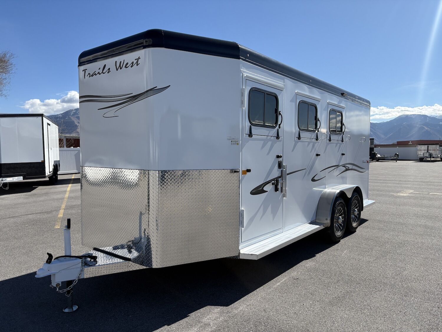 The Trails West Classic model is constructed with a steel frame and aluminum skins. It’s 7’0″ wide, and 7’0″ tall and comes standard with custom drop-down feed doors with face grills on the head side, sliding windows on the tail side, and a roof vent in each stall. The large 41″ stalls provide plenty of room and comfort for your horse and feature the industry’s best slam latch divider system. The tack room is roomy and functional and features their state-of-the-art swing-out saddle and blanket racks.