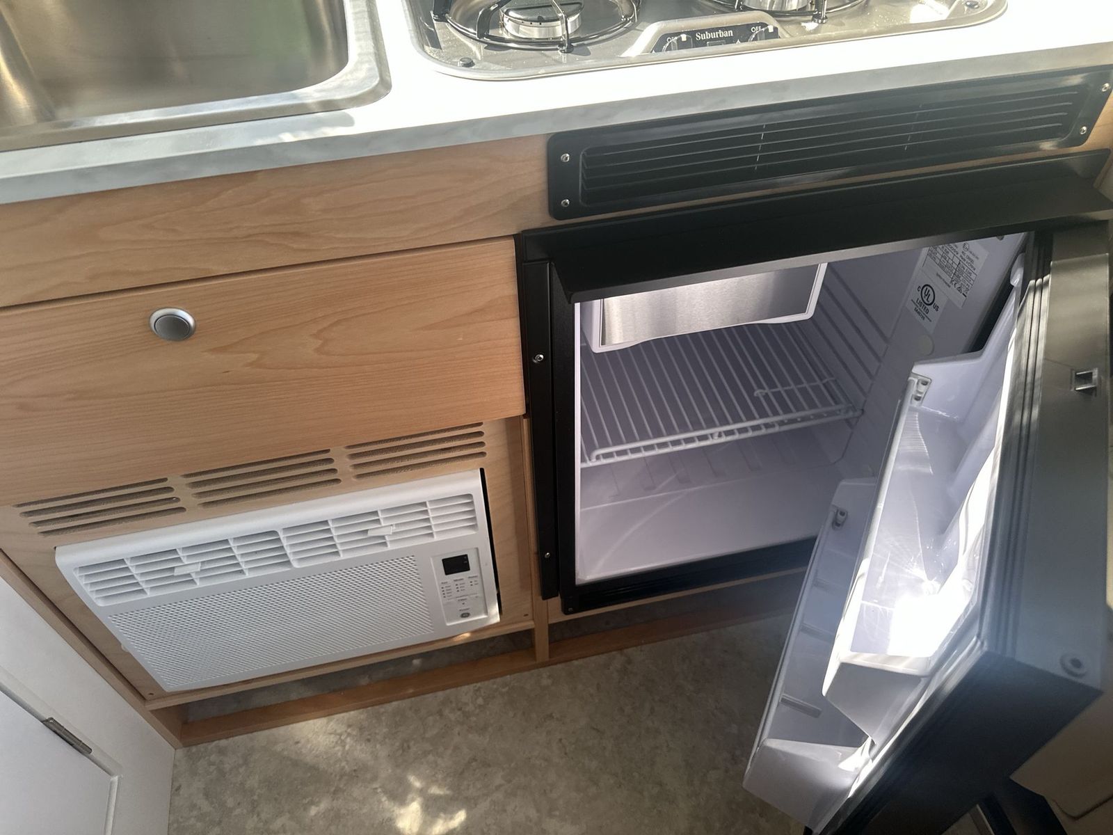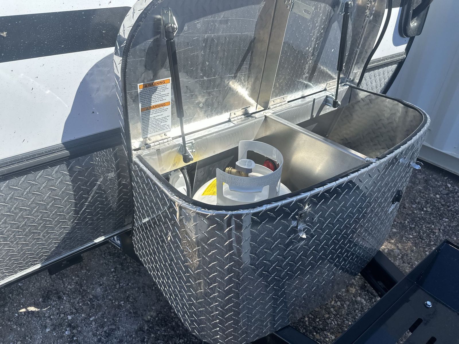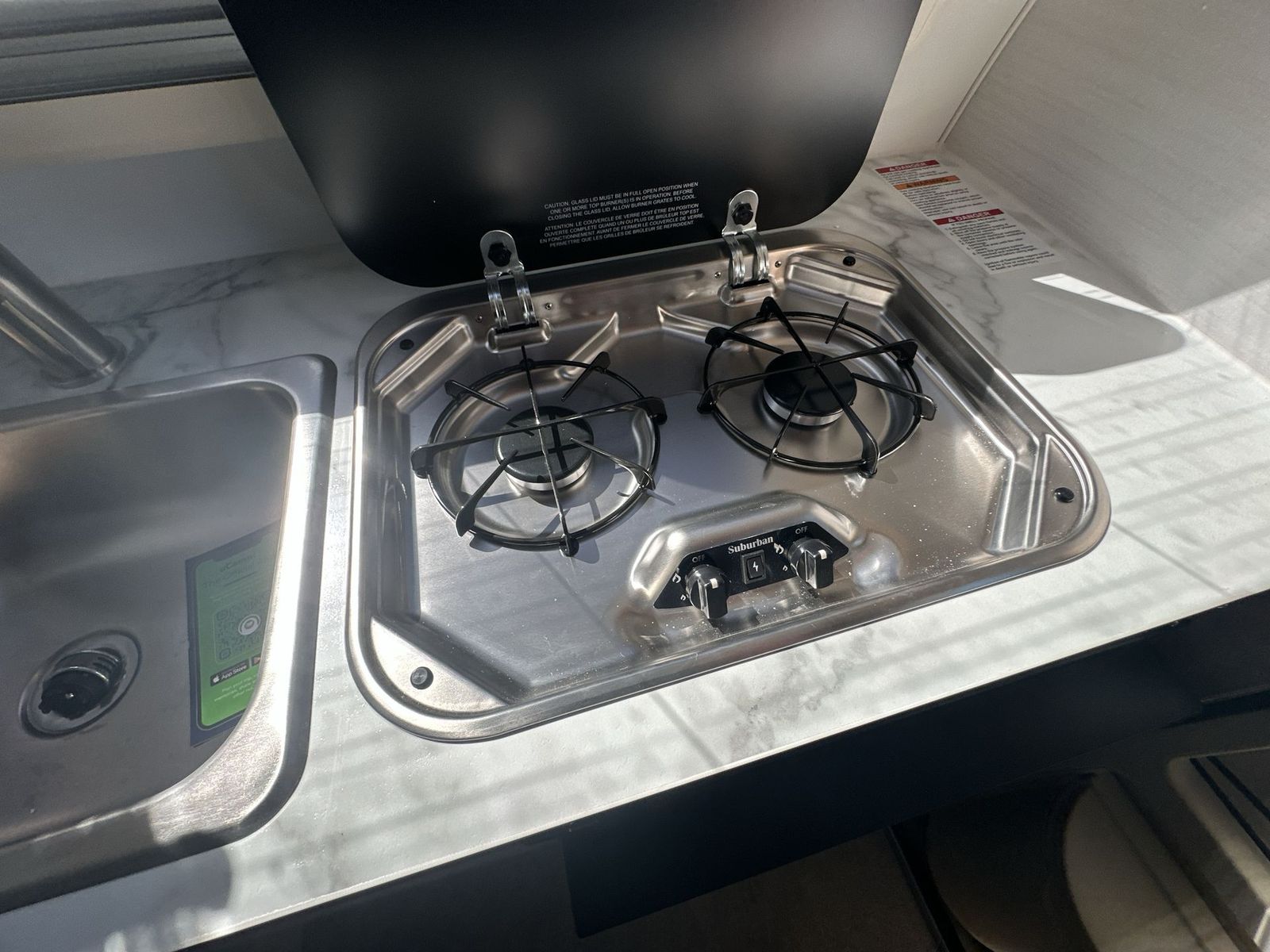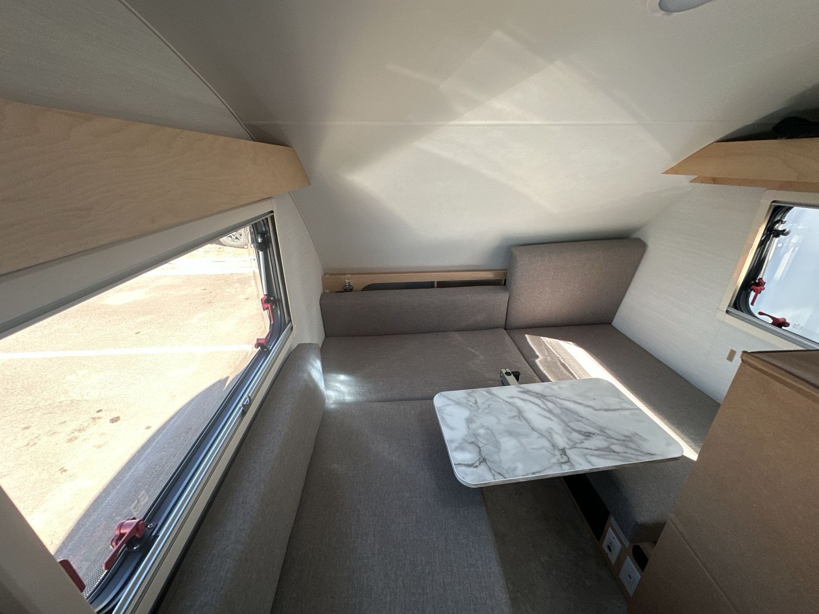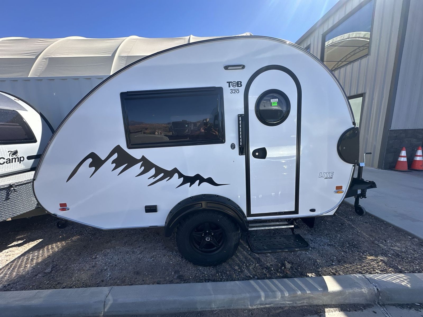 nuCamp RV TAB 320 LITE teardrop trailer Std. Model highlights: Two Burner Stove Wet Bath Front Window 15' 3" Total Exterior Length Hitch up and go at the drop of a hat with this cozy teardrop trailer! You will love how easy it will be to tow this unit, and you'll be surprised to find everything you need for hassle-free camping trips. An expandable split bed/dinette provides a place to relax, eat and sleep, and a two-burner stove with a glass top will let you make meals inside when you don't want to cook over the campfire. You can choose to add an optional microwave for even more convenience, and the standard 12V compressor refrigerator will keep your cold items fresh. Easily freshen up each day in the wet bath that includes a cassette toilet with a molded sink. The TAB 320 LITE teardrop trailer by nuCamp RV offers a simple, more affordable, and more approachable way of camping. There is a molded underbelly shield, alloy wheels, aggressive off-road tires, plus Boondock molded fenders and a Boondock entry door handle and step. A front diamond plate storage tub will keep your camp gear secure, and a 120-watt solar panel will provide off-grid capabilities. This teardrop trailer features an LP furnace and an A/C unit, along with an LP water heater for added comfort. Inside, you will love the premium soft-close cabinetry, composite flooring, side porthole windows, and front window for great outdoor views.