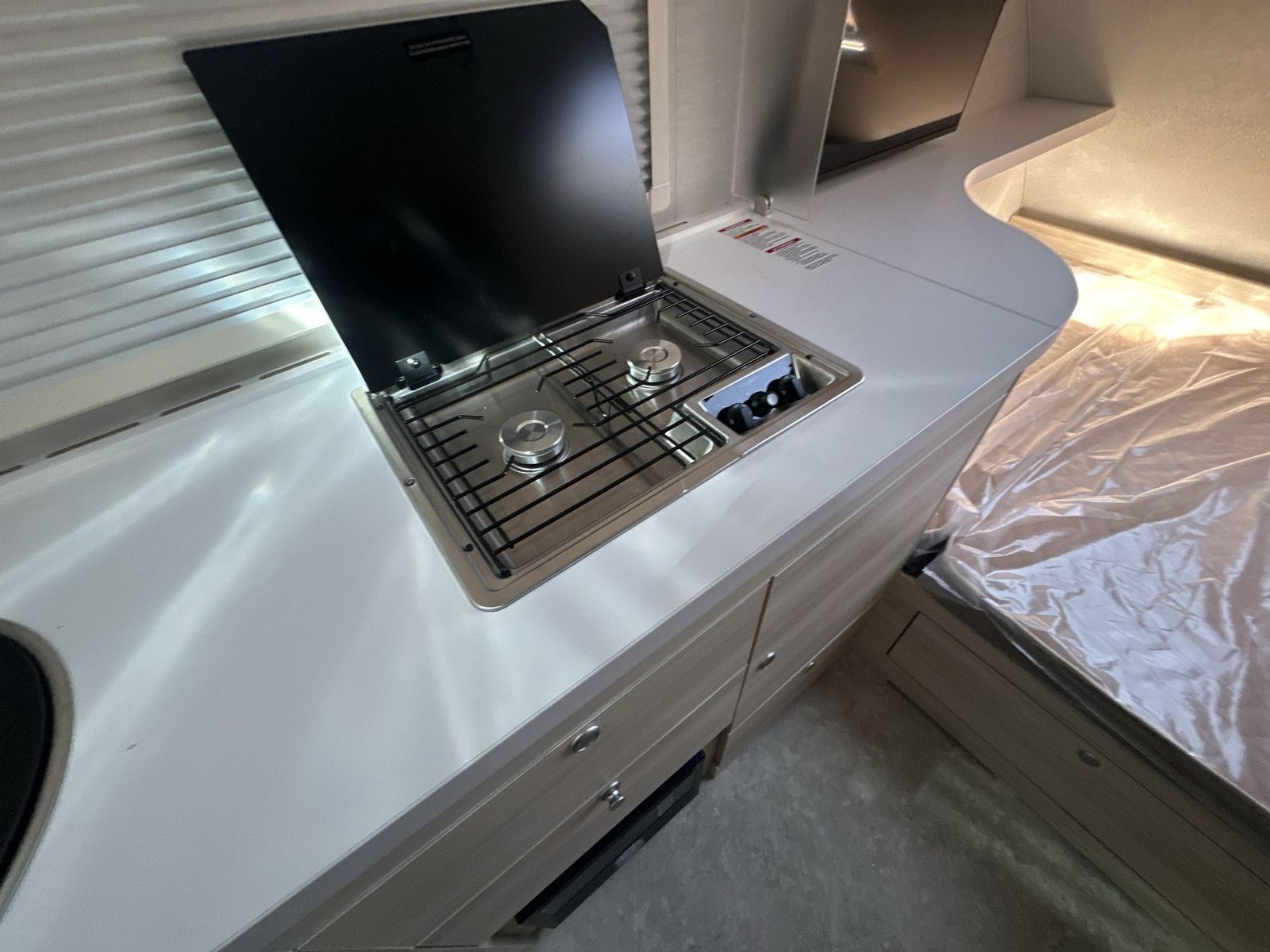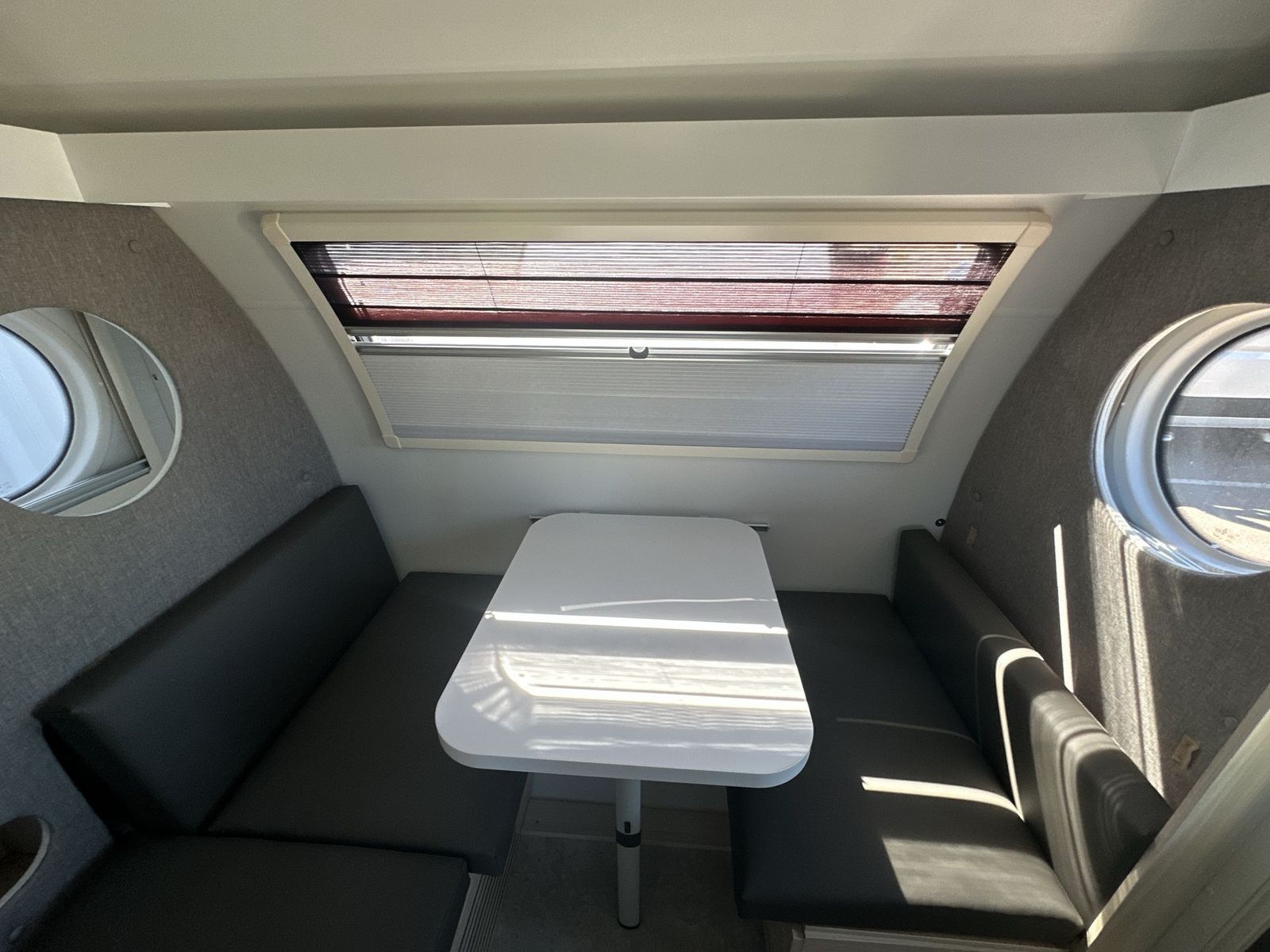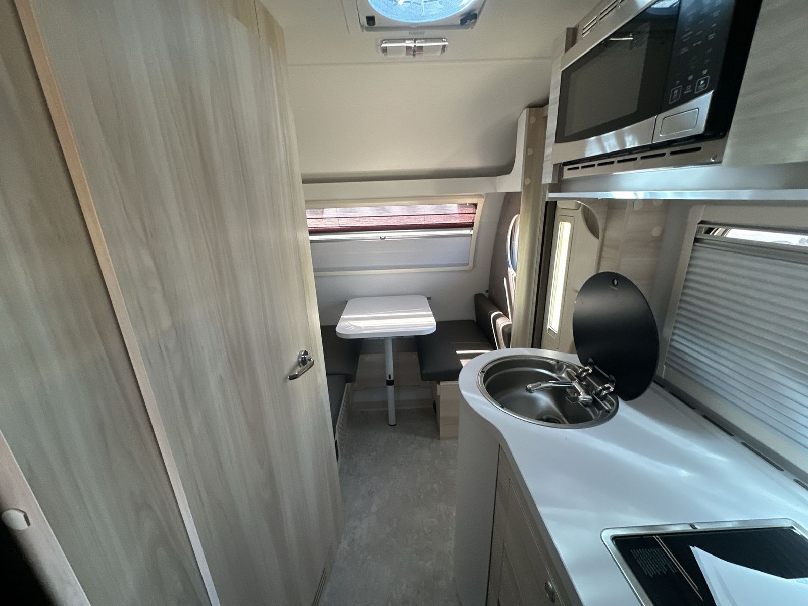 nuCamp RV TAB 400 teardrop trailer Boondock highlights: Wet Bath Seating/Dining Area Large Picture Window 24" TV Boondock Entry Door Handle This teardrop trailer offers sleeping space for three with two sleeping areas;one up front and one in the rear. The dinette allows you to eat and relax during the day, and at night this space becomes sleeping space for one. And if you're needing even more sleeping space, you can choose the optional bunk floorplan! The queen-size sleeping area is located on the opposite side with the wet bath in between for convenience for all. The galley kitchen will give the cook a place to make warm meals and store leftovers in the 4.6 cu. ft. 12V compressor refrigerator. Everyone can watch the 24" TV through the Bluetooth media center before bedtime, or in the morning as you all plan your next activity. And the Alde central heating/hot water system, as well as central air conditioningwill keep you comfortable wherever you set up. An optional Black Canyon Upgrade is available with an additional 310-watt solar panel, holding tank heaters, underglow lights, and an XL diamond plate storage tub. The TAB 400 by nuCamp RV is mighty in essentials and spacious for a teardrop trailer! There is a Froli sleep system, a spacious wet bath, a galley kitchen and plenty of storage plus a dinette. Inside you will enjoy the Bluetooth media center, premium soft-close cabinetry, and an expansive picture window. You'll also find composite flooring, a rail table, and a power roof fan to name a few more comforts. The Convenience Package comes with a 310-watt solar panel, a 1,200-watt power inverter, a 100AH 12-volt lithium battery, and more features to help you camp off grid! Along with the optional Black Canyon Upgrade, you can also choose the optional Lithium Battery Upgrade, an optional microwave, and an optional Maxxair fan to further customize your camper!