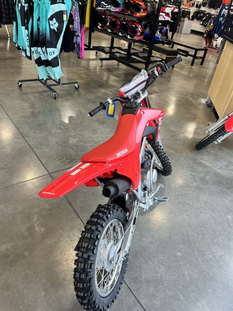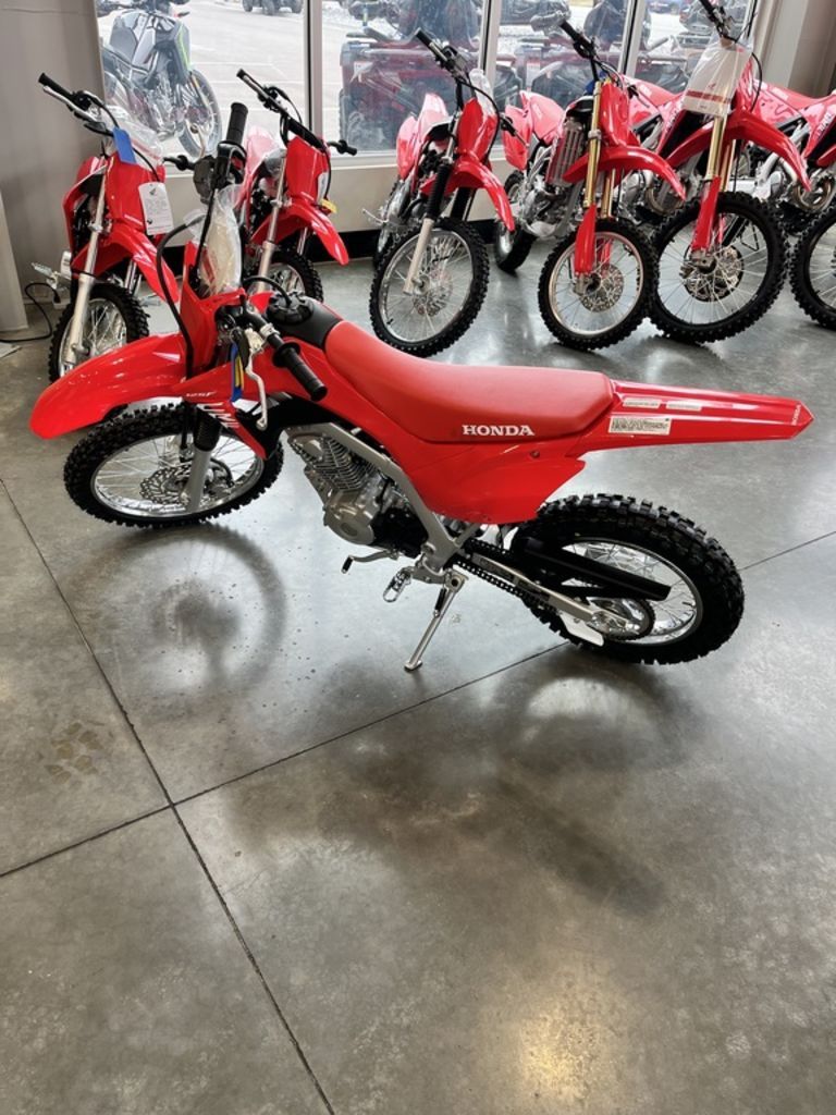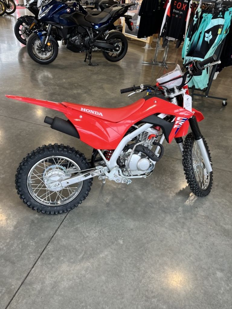 2026 Honda® CRF125F Two sizes. One legendary ride. With user-friendly power, legendary Honda reliability, and big bike-style manual clutch, the CRF125F is ready for riders on the rise. Available in both standard and Big Wheel trims, it features fuel injection, electric start, and a durable four-stroke engine—perfect for stepping up or anyone ready to hit the trail and never look back. Features may include: First trails to real thrills Suspension swallows bumps for breakfast The perfect off-road bike is all about power and fit Family fun begins with a Honda Smooth four-stroke power Reliable engine The four-stroke, single-cylinder engine has a broad powerband and offers dependable performance for beginners. Fuel injection enhances its efficiency. Full-sized feel, sized just right Pro-Link® rear suspension Our Pro-Link® progressive suspension connects a single heavy-duty shock to the swingarm, delivering an excellent combination over a wide range of riding conditions. Four-speed transmission The four-speed gearbox is identical to a full-sized off-road motorcycle, providing complete control. Keyed ignition switch A keyed ignition switch allows you to control who can ride the vehicle, which is especially important if younger riders are in the home.