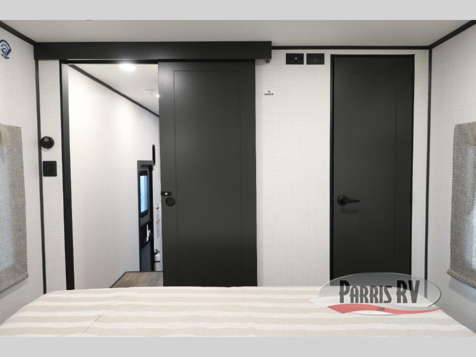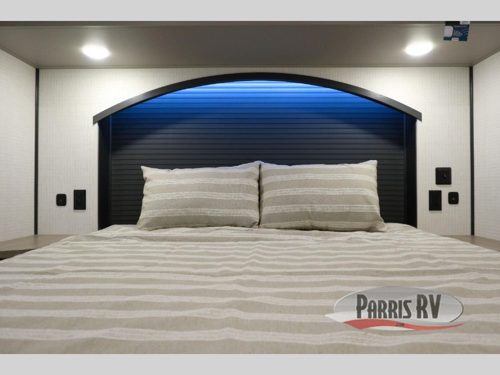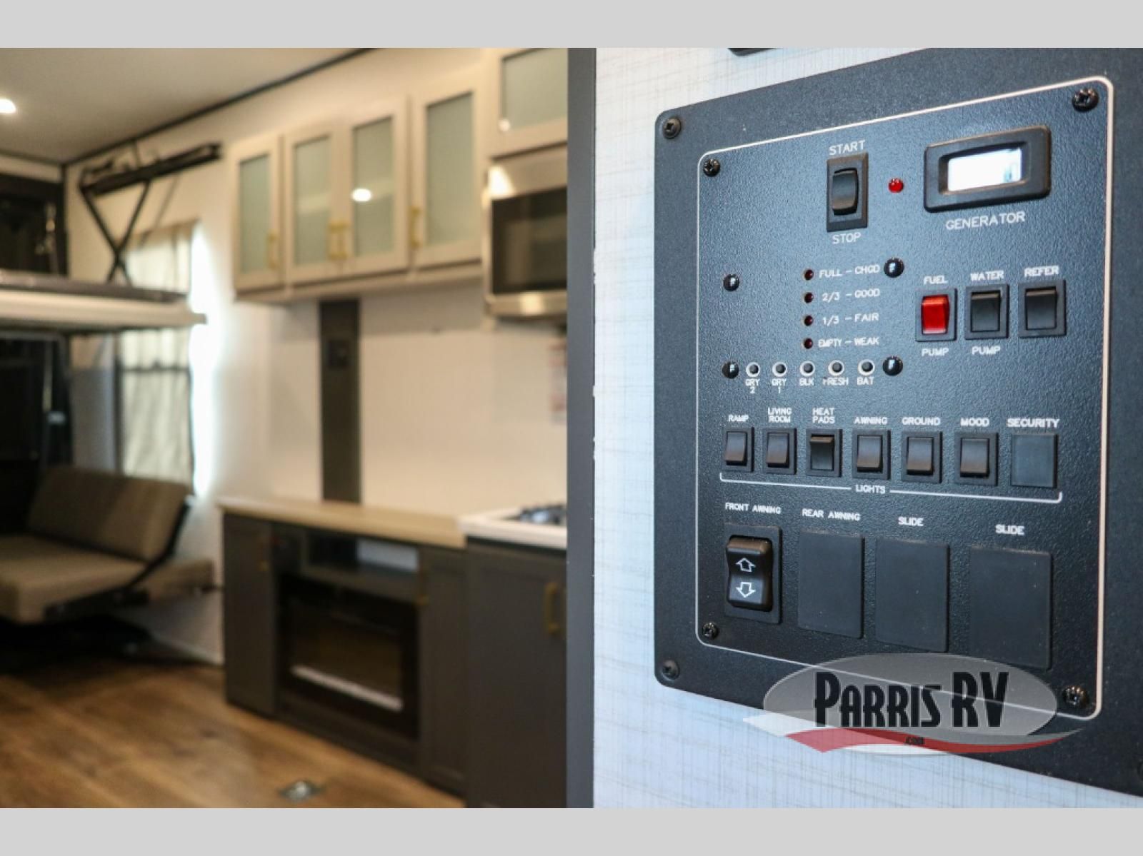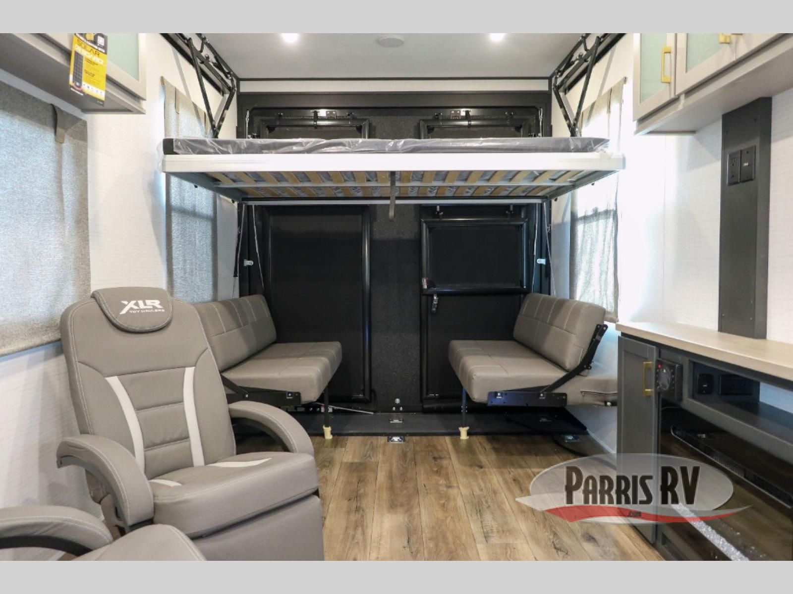 This toy hauler includes everything you need while at the campground. A front private bedroom includes an RV queen bed, dual nightstands and wardrobes plus a third wardrobe to keep your space tidy. The full bath will let you freshen up each day, and there is a convenient medicine cabinet to keep first aid items on hand. A three burner cooktop and microwave oven will be perfect to cook meals with, and there are dual gaucho sofas with a removable dinette table to dine at. Your guests can sleep here at night, along with the queen-size Euro lift bed above!