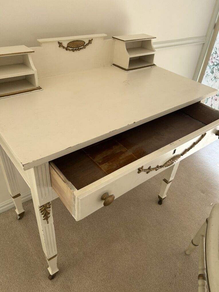 This particular writing desk, with its cream finish and gilded accents, likely dates from the early 20th century, possibly reflecting a later interpretation or revival of the Napoleon III style. Such desks were functional pieces designed for writing and correspondence, often placed in parlors or bedrooms. The addition of the small hutch with shelves suggests a need for organized storage for stationery and writing implements, common for the era.