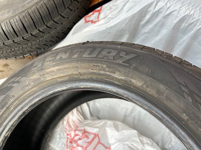 2 Sentury DHP, size 225 / 50 R17, 98 W speed rated (bought from Discount Tires in Overland Park, KS, and replaced in Boulder, so about 650 miles on them)