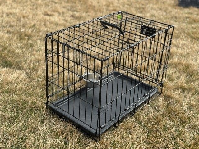 Compact 22x13x16 black wire pet crate in great condition, perfect for dogs, cats, or rabbits up to 15 lbs. Features a secure latch, removable easy-clean tray, and top handle for easy transport. Includes a stainless steel clip-on bowl, making it an ideal setup for toy breeds like Chihuahuas, Yorkies, or Pomeranians.