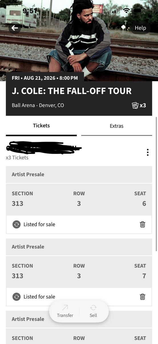 ZelleI have 3 tickets I need to sell for his concert on Friday August 21st. The seats are section 313 row 3 Seats 6-8. Asking for 450.00 each obo