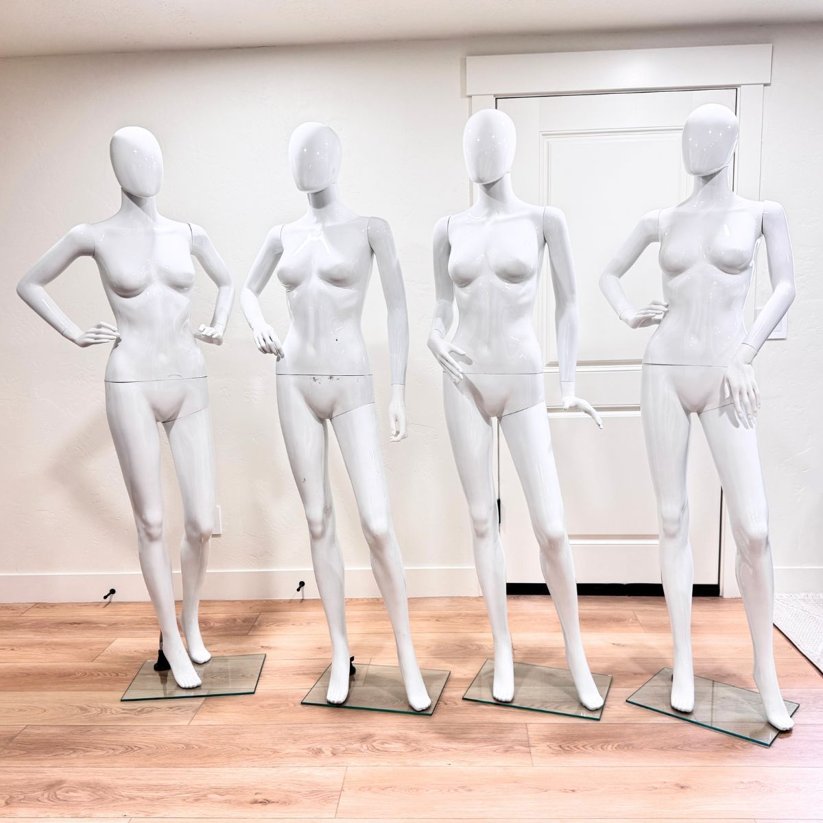 • White standing full-body female mannequins.