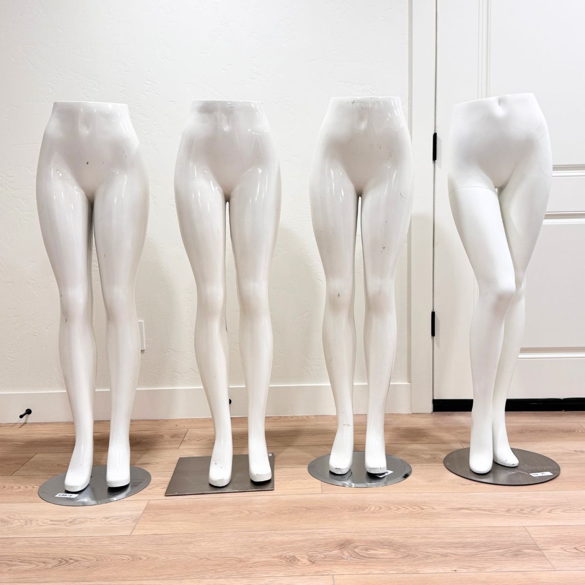 • White female lower-half leg/hip forms (curvy, on bases – for pants/leggings).