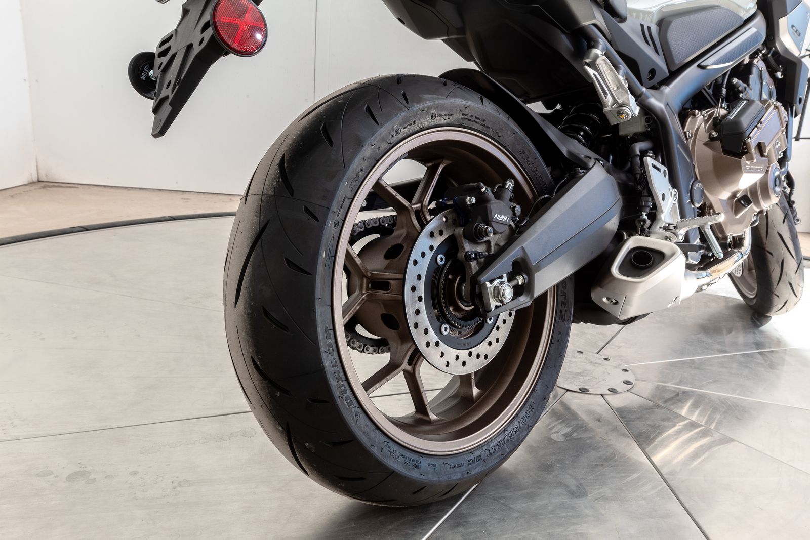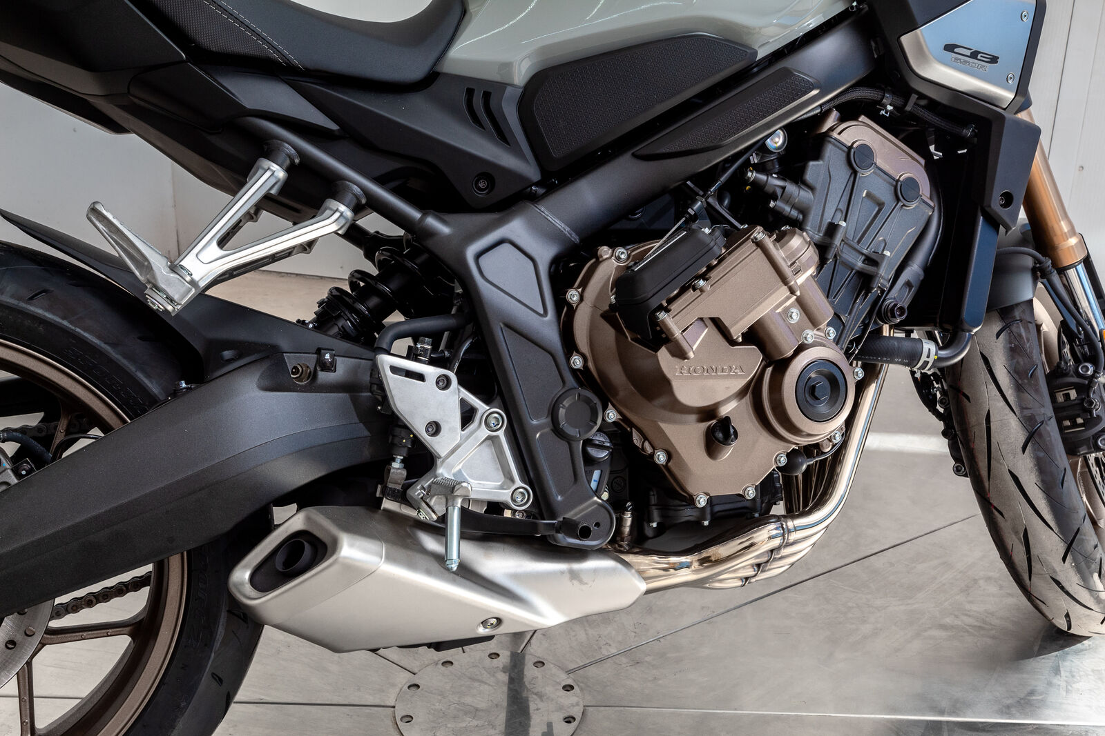 The Showa® Separate Function Front Fork Big Piston (SFF-BP) suspension ensures precision handling and smooth steering. This premium suspension system balances reduced weight with superior rigidity, making the CB650R a joy to ride on winding roads or tight urban turns.