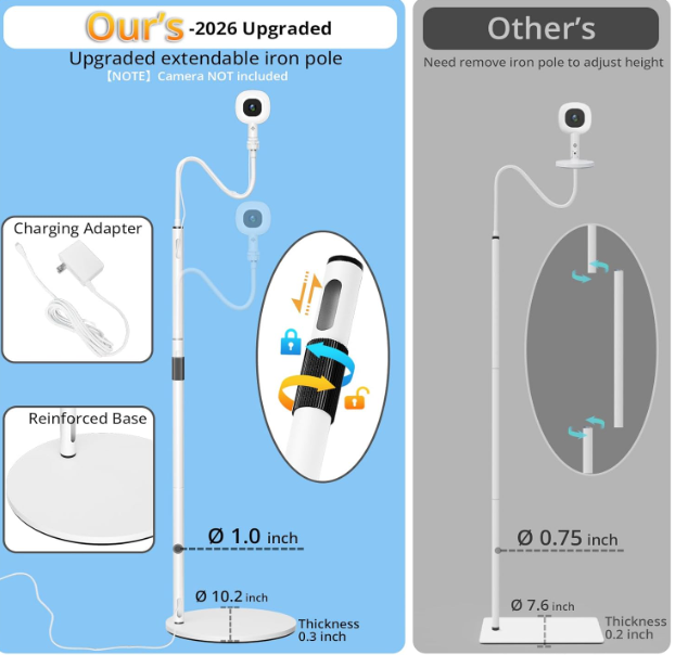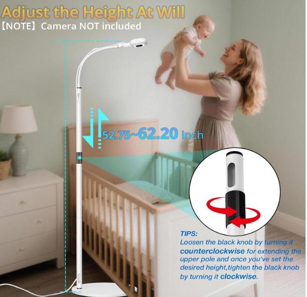 Upgraded Floor Stand for Nanit Pro Baby Monitor, Heavy-Duty Gooseneck 360° Swivel Holder Mount-Extendable Height & Stable Base with 10FT Charging Cable Adapter-Prevents Falling Off