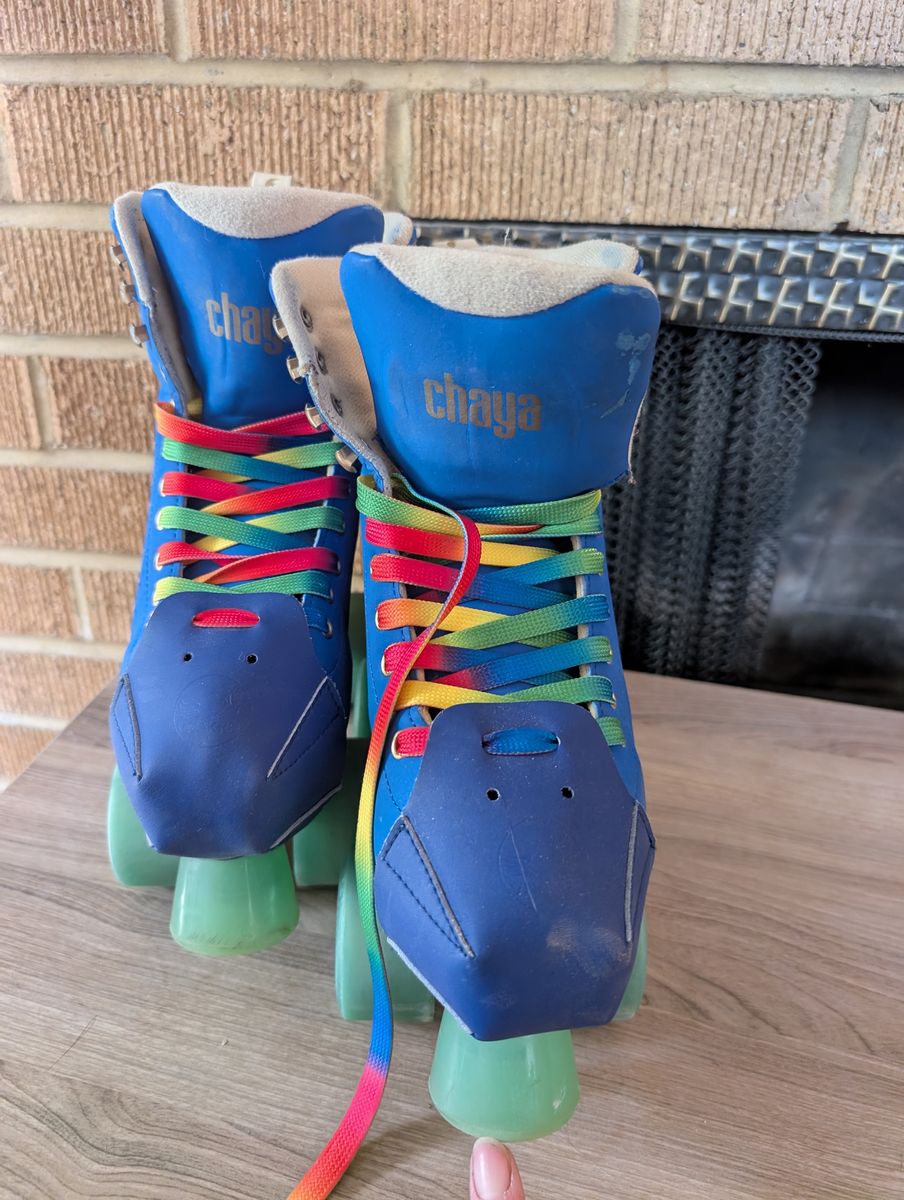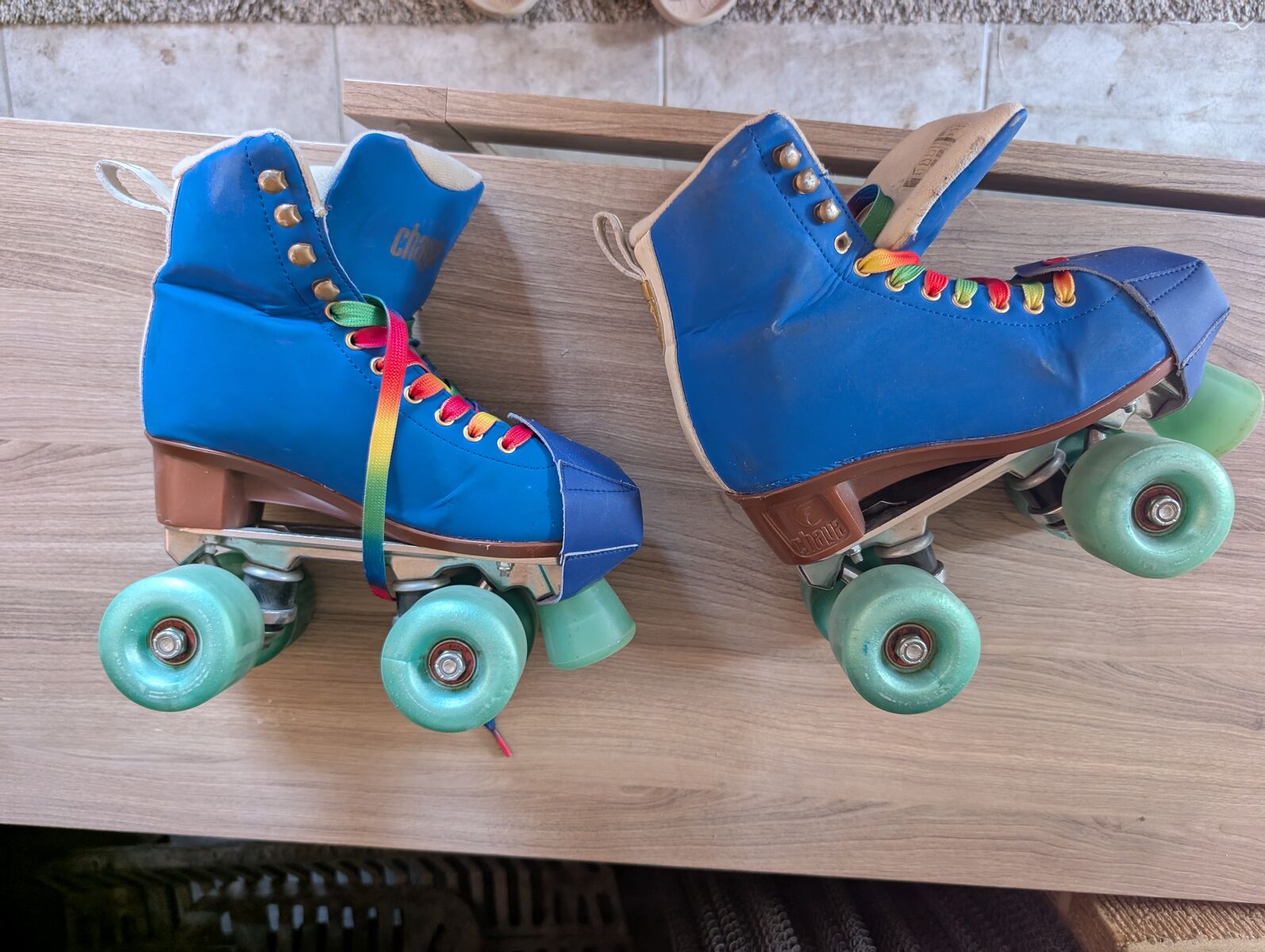 ZelleCHAYA Melrose Deluxe cobalt blue rollerskates on outdoor Omni wheels, Galaxy aluminum plates, and Wicked ABEC 7 bearings. These are great skates with no plastic parts (some of the cheaper skates like impalas will often have plastic plates), some scuffs under the toe guards and one of the lace holders at the top is damaged but these are in great condition and you can skate on them as is!