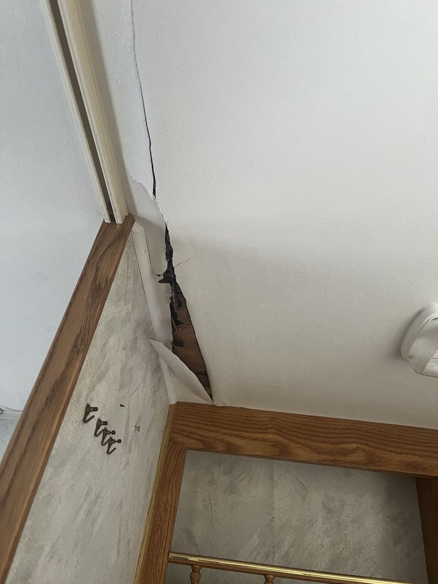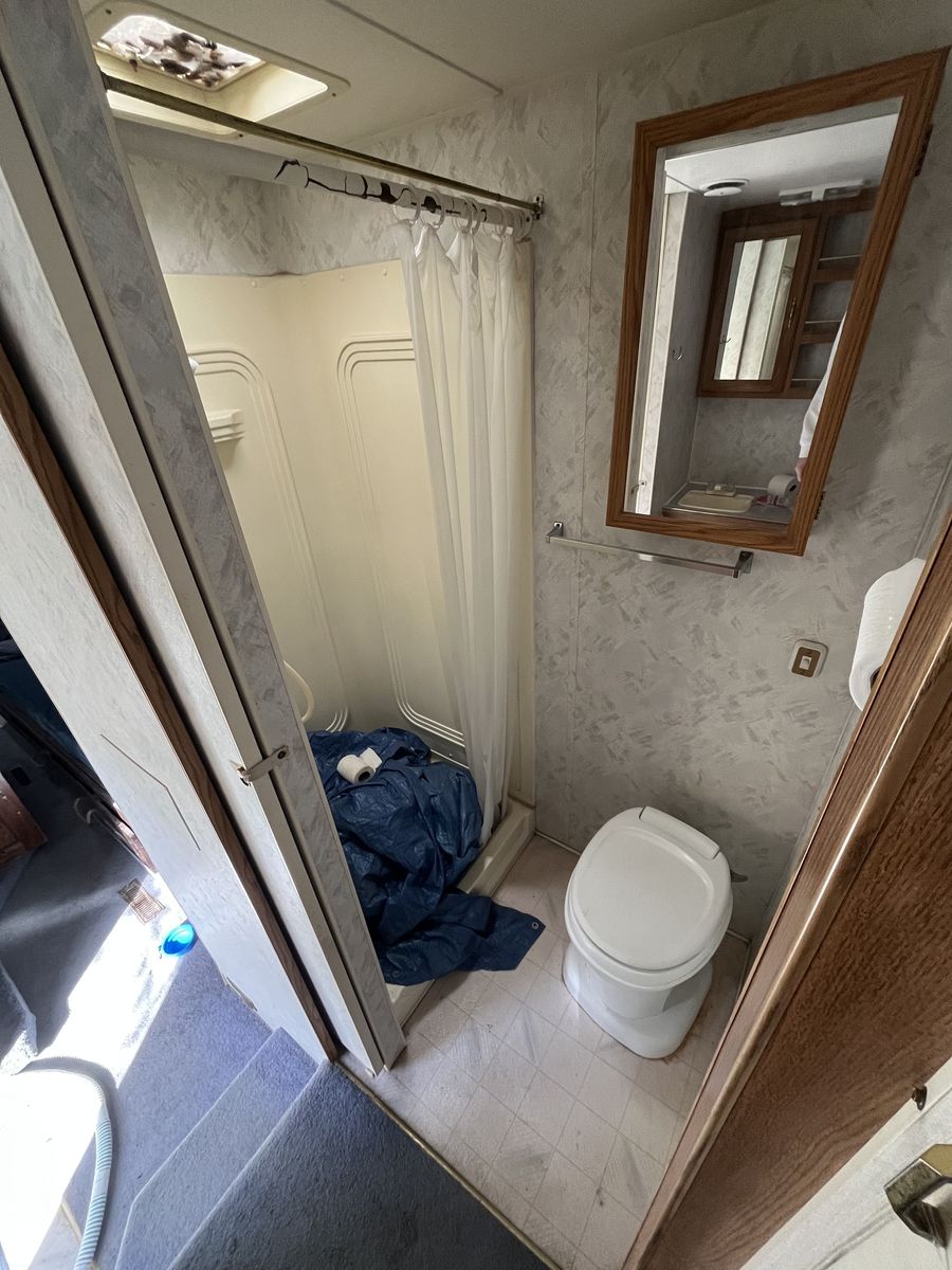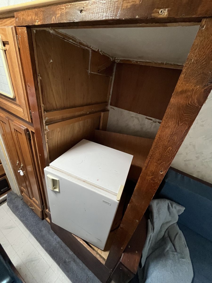Now for some of the bad. The roof definitely leaks and there is some water damage on the inside above the sink (pictured). There is also some delamination happening on the driver side (pictured) being held together with tape and a prayer. The water pump works, but the hose that leads to the tank from the filler neck is non-existent. I do have a new one, just never got around to installing.